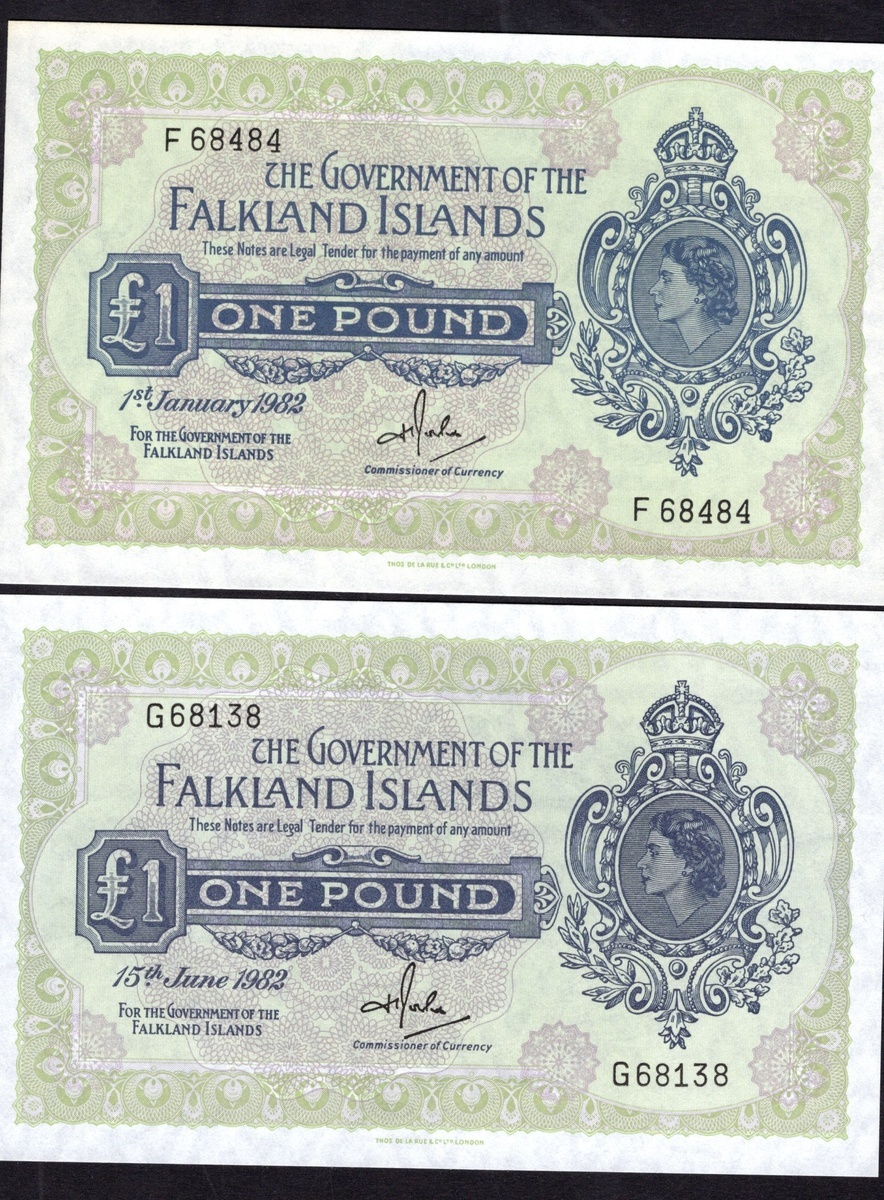 Falkland Islands. Government of the Falkland Islands. Pair of 1 Pound Notes. 1 January and 15 June 1982. P-8d, e. Blue on green and lilac. Elizabeth II portrait at right. Crisp Uncirculated. [2]