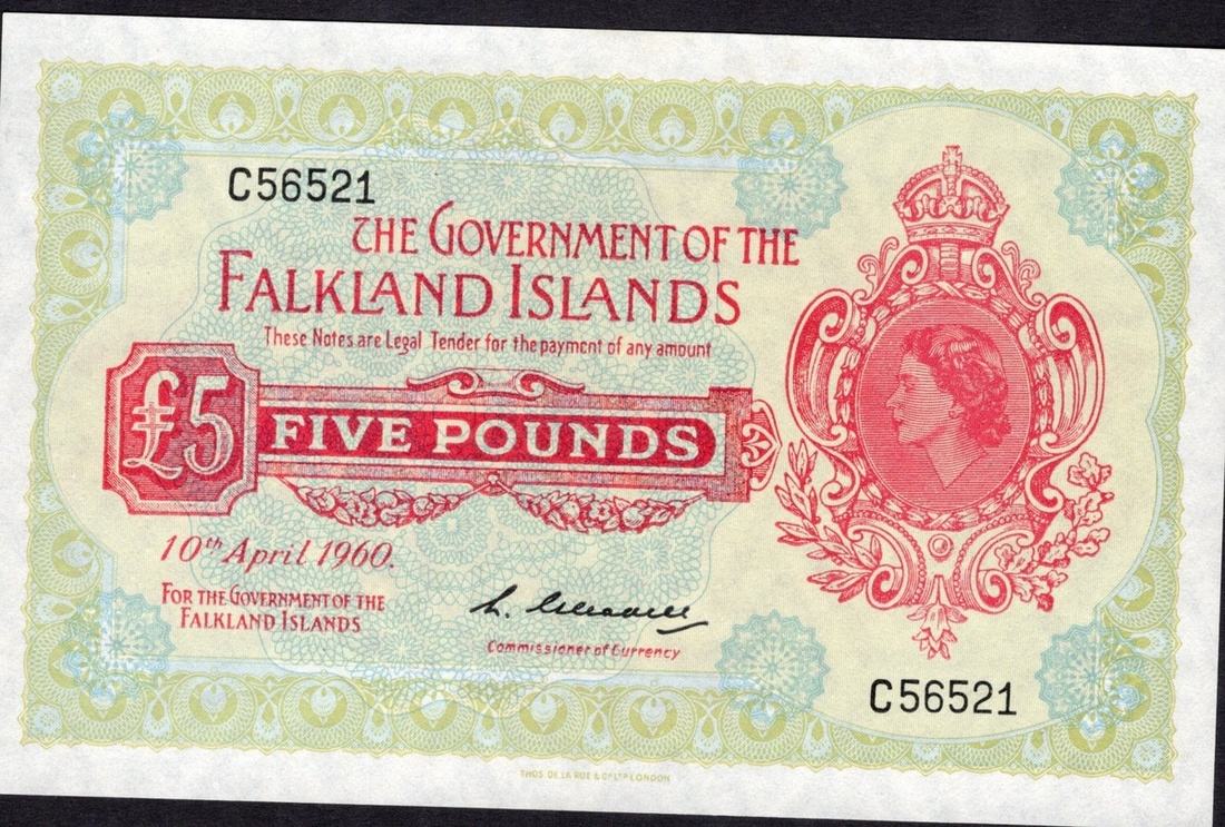 Falkland Islands. Government of the Falkland Islands. 5 Pounds. 1960. P-9a. No. C56521. Red on green. Elizabeth II portrait at right. AU-Unc.