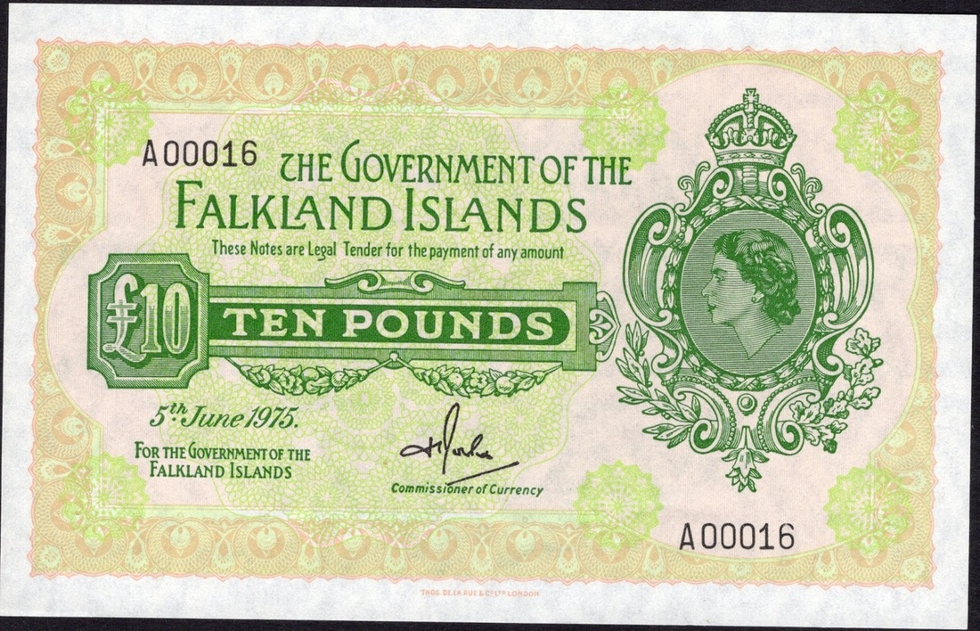 Falkland Islands. Government of the Falkland Islands. 10 Pounds. 1975. P-11a. No. A00016. Green on light orange and yellow-green. Elizabeth II portrait at right. Slight teller handling. Uncirculated.