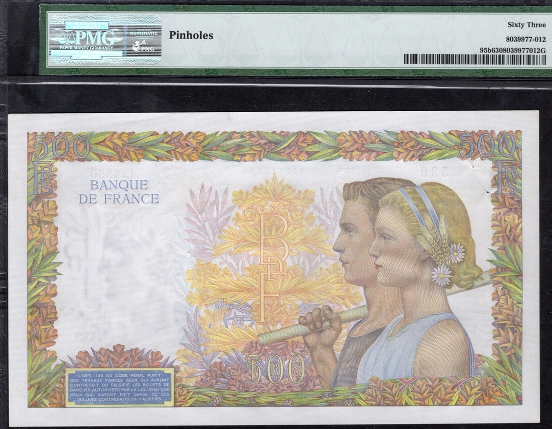 France. Banque de France. 500 Francs. 29-1-1942. P-95b. No. C.4550 539. Green, lilac and multicolor. Pax at left; Young farmer couple at back right. PMG Choice Uncirculated 63, pinholes.