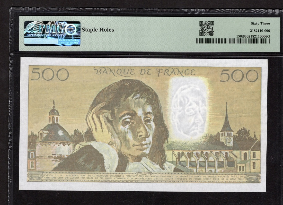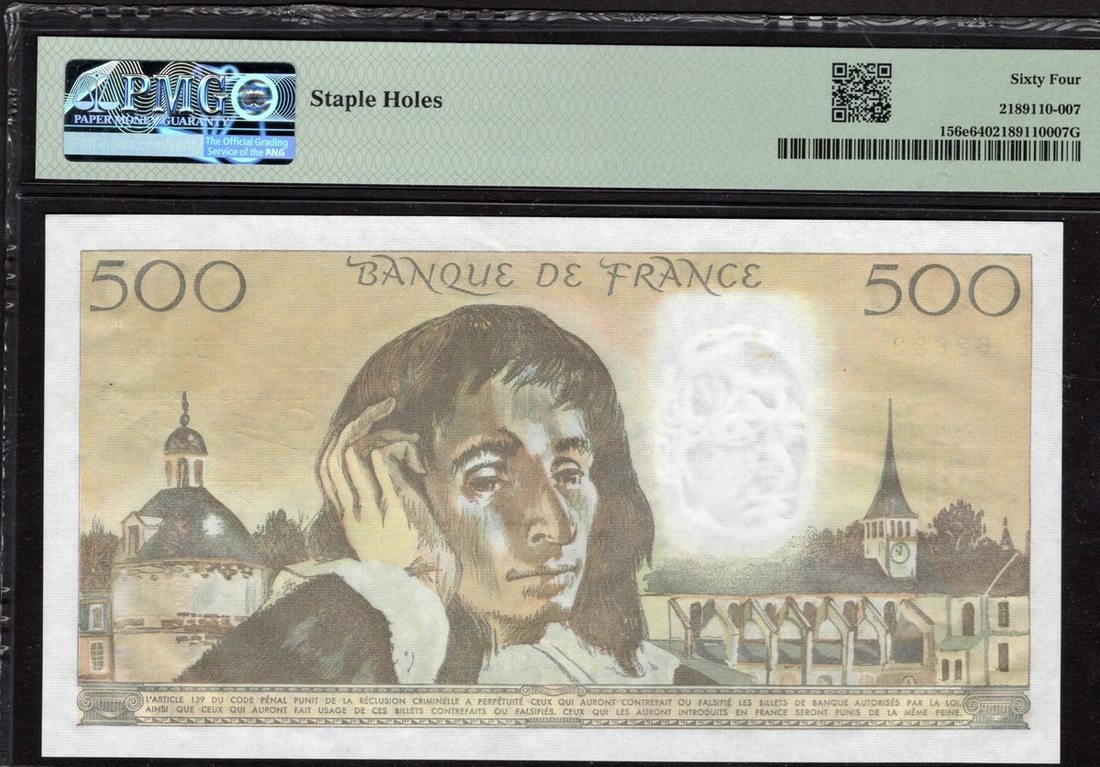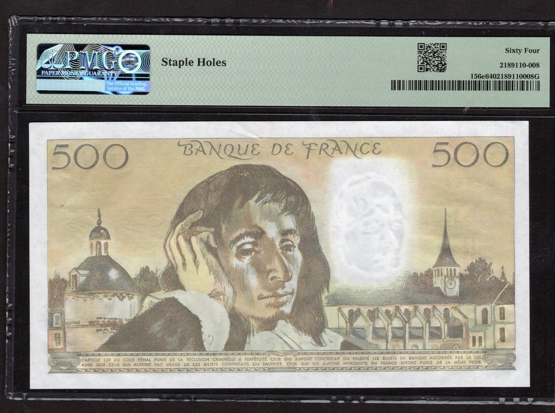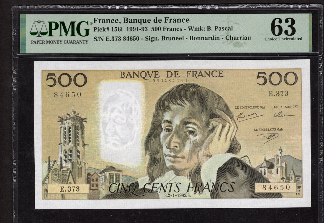 France. Banque de France. Trio of 500 Francs. 7-1-1982 (2); and 2-1992. P-156e, i. Yellow-brown and dark brown. Blaise Pascal. The P-156-e consecutive numbers. PMG Choice Uncirculated 64; staple holes. The latter PMG Choice Uncirculated 63; staple holes. [3]