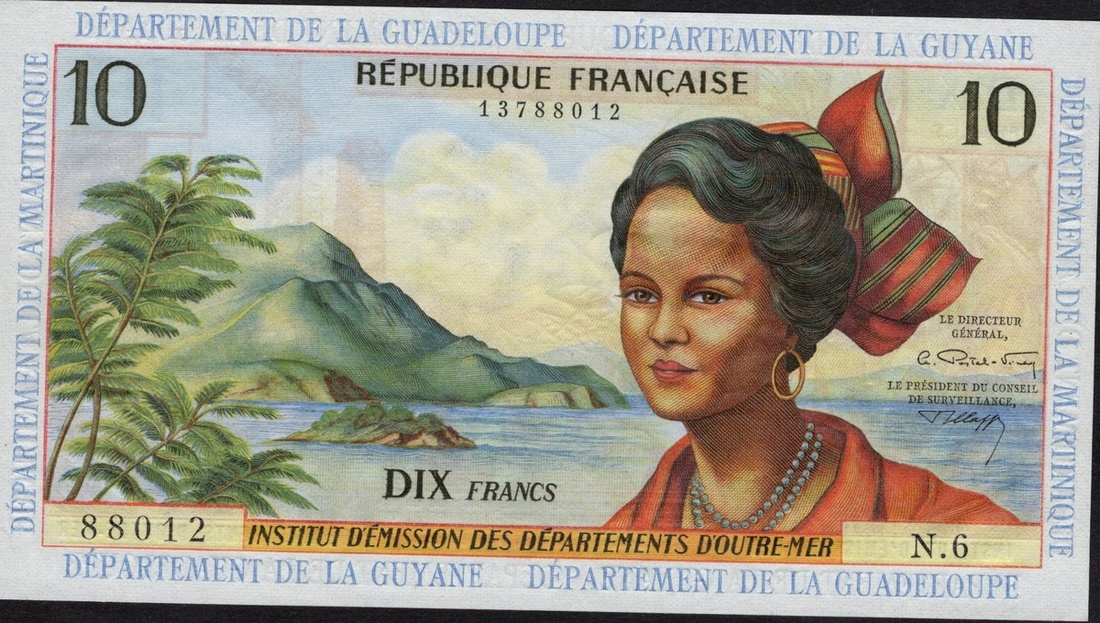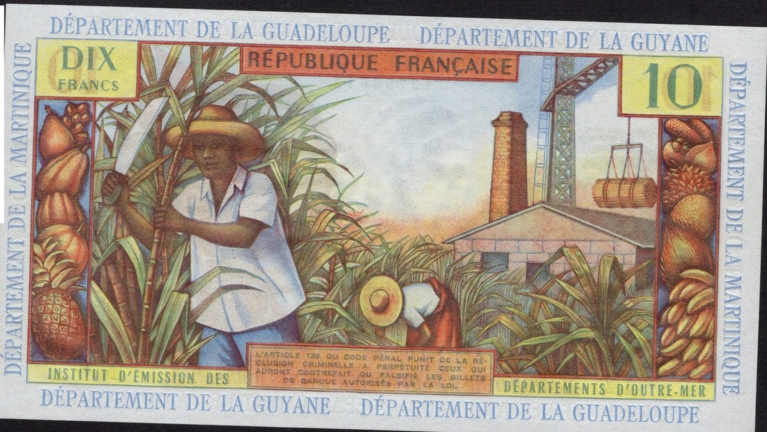French Antilles. Institut d'Émission des Départments d'Outre-Mer. 10 Francs. ND (1964). P-8b. No. N.6 88012. Signatures: Postel-Vinay, Clappier. Green on multicolor. Shoreline, young woman at right; Banana harvest on back. Choice AU.