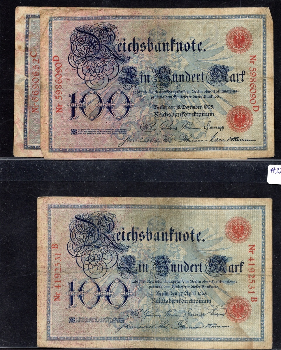 Germany. Imperial-Weimar. Collection of Banknotes, 1904-1923 Sixth Issue. Includes: P-8a, b, 9b, 22, 24a, b, 25a, 26a, 26b, 31, 32, 33a, 34, 35, 38. 40b, 41, 43, 45a, 44, 45b, 46, 47b,c, 48b, 49b, 50 (2), 51 (2), 52, 53, 54 (2), 55, 56 (10), 56 with MUNSTER stencilled, 57, 58 (2), 59, 60, 61, 62, 63, 66 (4), 67a (2), 68, 69 (2), 72 (2), 74a (2), c (3), 75, 76 (11), 81 (10), 85 (12), 86a, 91a (3), b, 92b (4), 93 (2), 94 (3), 95 (2), 96, 97a, b (2) 98a, b (2), 99, 100a, b, 101 (3), 102 (4), 103 (7), 103error, 104 (4), 105 (5), 106 (8), 107 (18 - one used as Maryland paper money club mbrship voucher), 108 (6), 109 (10), 110 (7); also 2 fantasy pieces and other. Some with old collector's small notations in pencil in margins. Generally Fine-Unc. [Approx. 205]