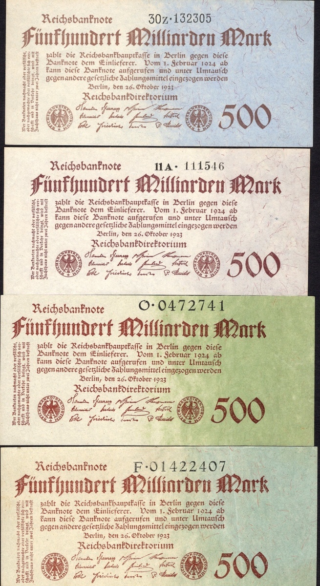 Germany. Weimar. Reichsbanknote. 500 Milliarden Mark. 1923 Ninth Issue group: P-127a (2). EF and Unc; P-127b (2). EF-AU and Unc. [4]