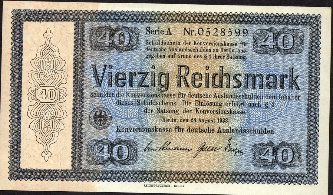 Germany. Third Reich. Conversion Fund for German Foreign Debts. 40 Reichsmark. 1933. P-202. Pinholes. Extremely Fine.