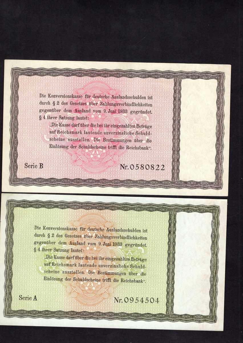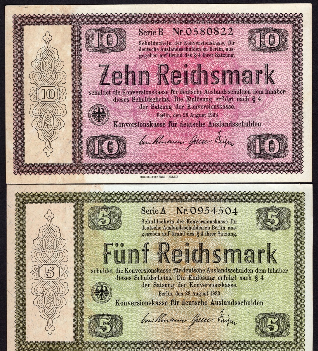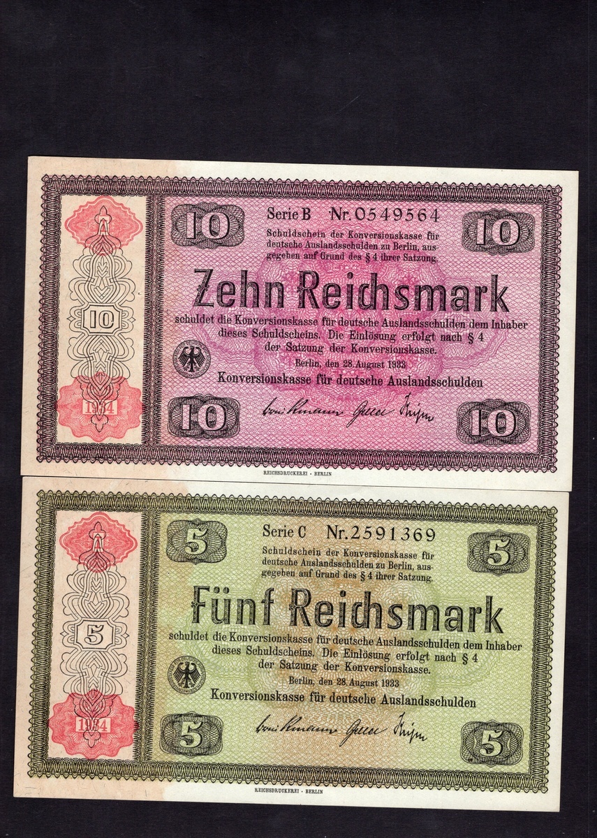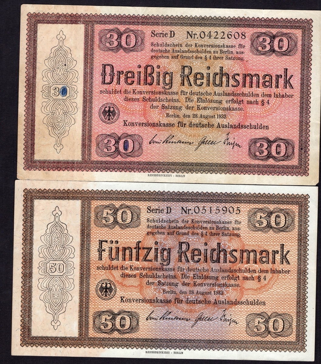 Germany. Third Reich. Conversion Fund for German Foreign Debts. 5, 10, 30 and 50 Reichsmark. 1933. P-199, 200, 201, 203. AU-Unc, Unc, VF with inkmark, and EF. [4]