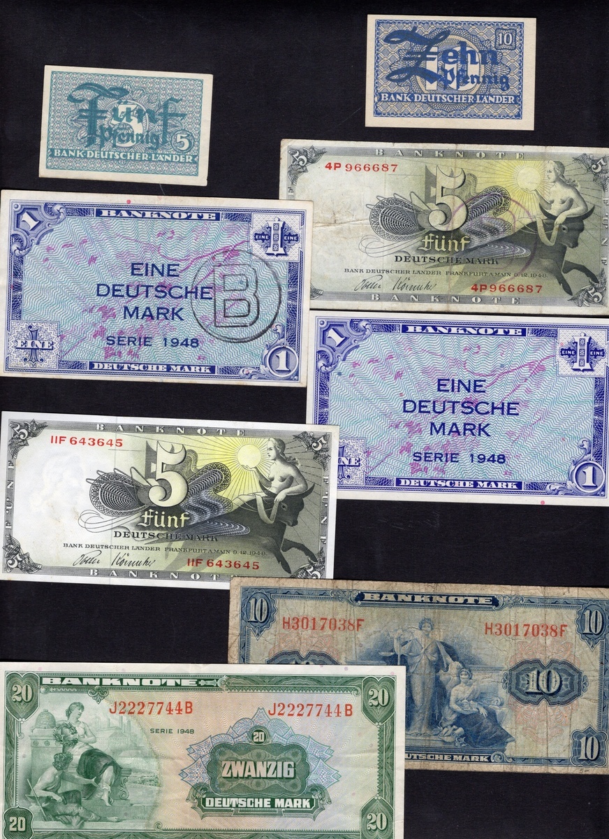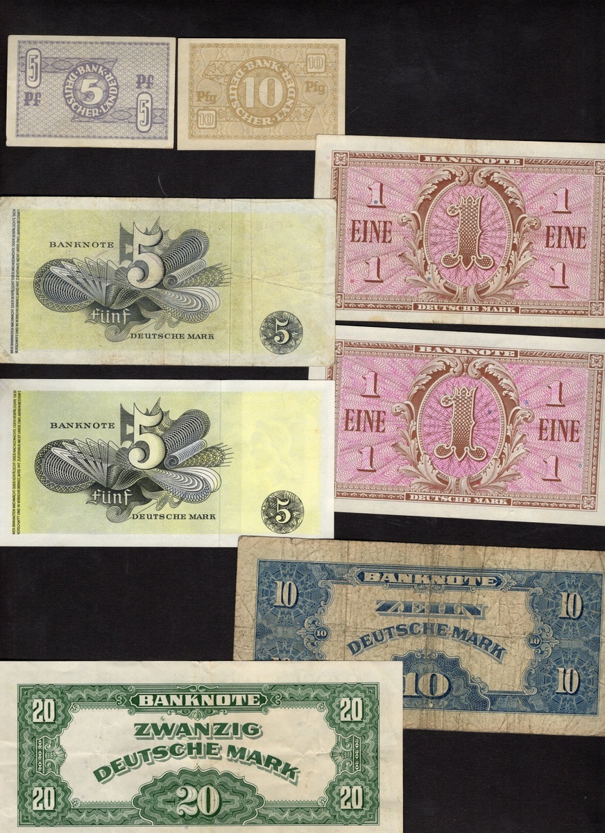 Germany. Allied Occupation-Post WWII. 1948 Lot. U.S. Army Command. 1 Deutsche Mark. P-2a,b. EF, VF; 10 Deutsche Mark. P-5a. VG; 20 Deutsche Mark. P-6a. F-About VF; Bank Deutscher Länder. 5 and 10 Pfennig. P-11, 12. EF, Unc; and 5 Deutsche Mark. P-13a, b. EF, About Fine. [8]