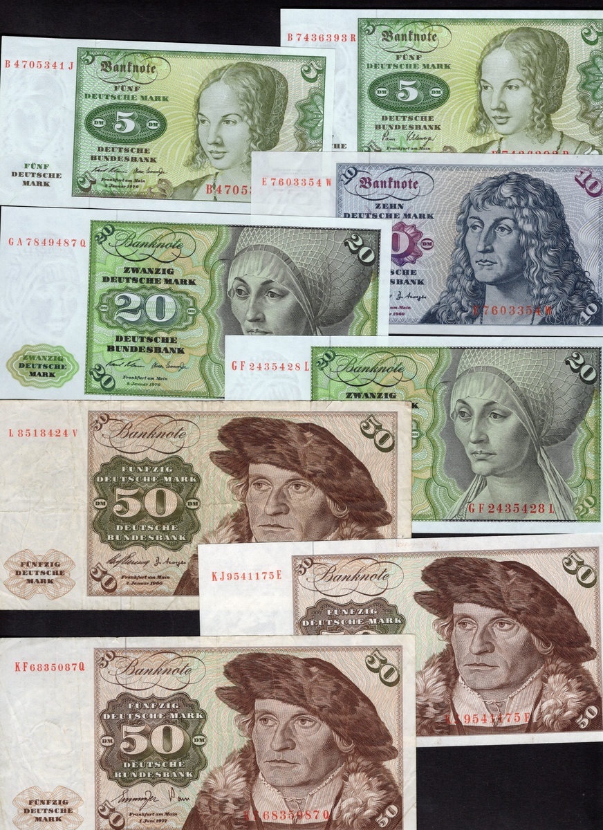 Germany - Federal Republic. Deutsche Bundesbank. 1970-1991 Lot. 5 Deutsche Mark - 1970. P-30a, 1980. P-30b (2), one a replacement note, 1991. P-37. Uncirculated; 10 Deutsche Mark - 1960. P-19. VF-EF, 1970. P-31a, 1980. P-31c. Unc; 20 Deutsche Mark - 1970. P-32a. EF-AU, 1977. AU; 50 Deutsche Mark. 1960. P-21. Fine, 1977. P-33b. Fine-About VF, 1980. P-33d. EF. [12]