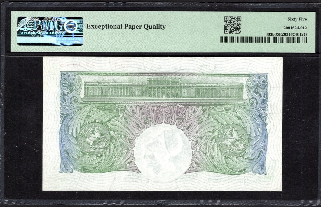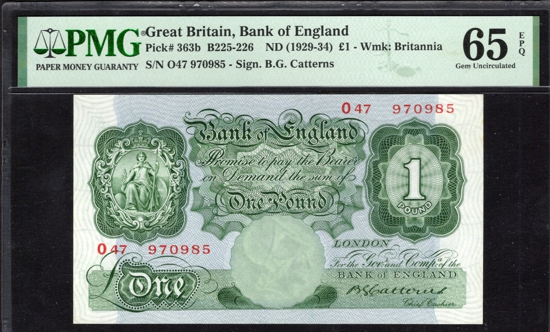 Great Britain. Bank of England. 1 Pound. ND (1929-34). P-363b. No. O47 970985. Signature: B.G. Catterns. Green; green, blue and mauve back. Britannia seated at left; St. George sovereign medallions on back. PMG Gem Uncirculated 65 EPQ.