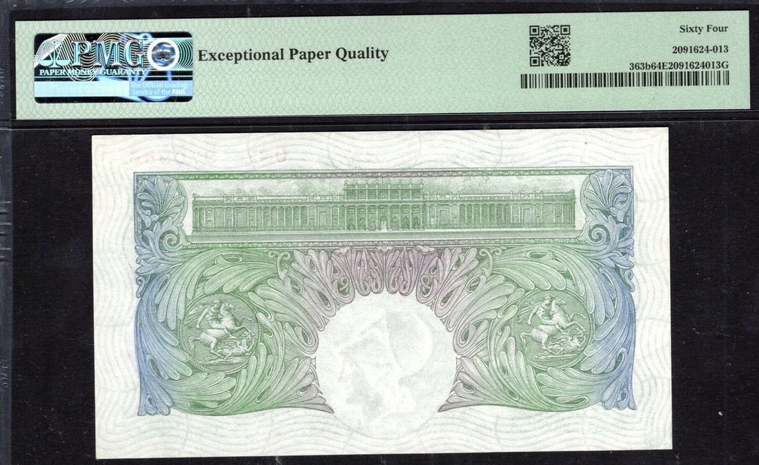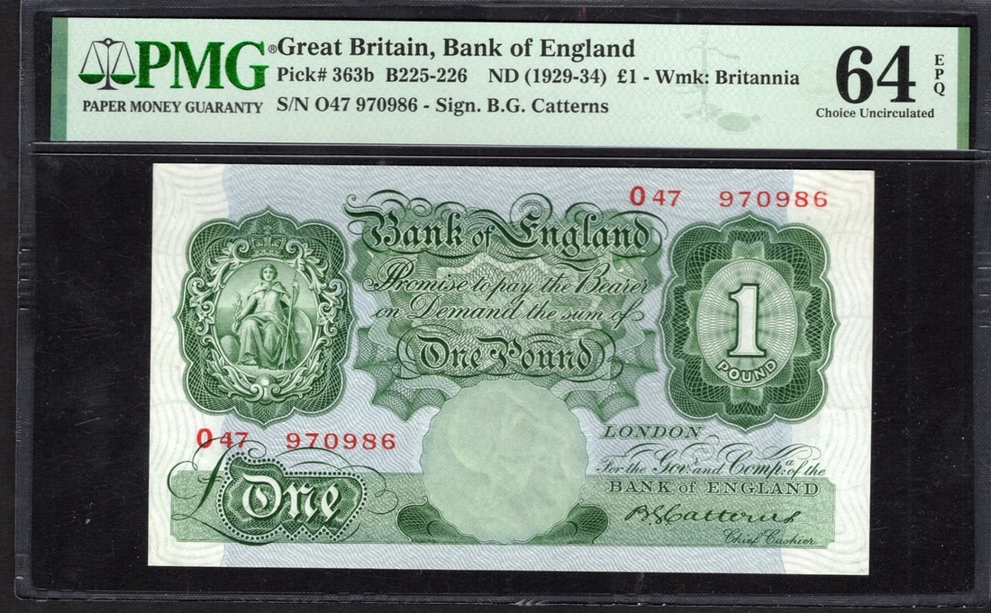 Great Britain. Bank of England. 1 Pound. ND (1929-34). P-363b. No. O47 970986. Signature: B.G. Catterns. Green; green, blue and mauve back. Britannia seated at left; St. George sovereign medallions on back. PMG Choice Uncirculated 64 EPQ.