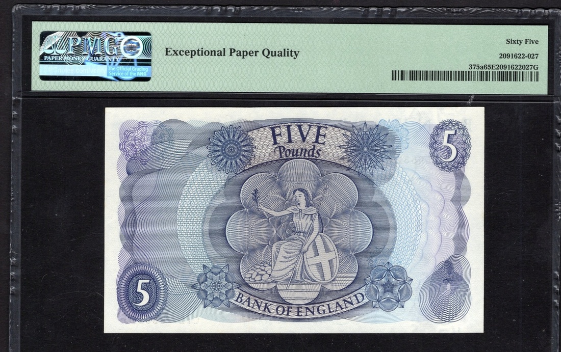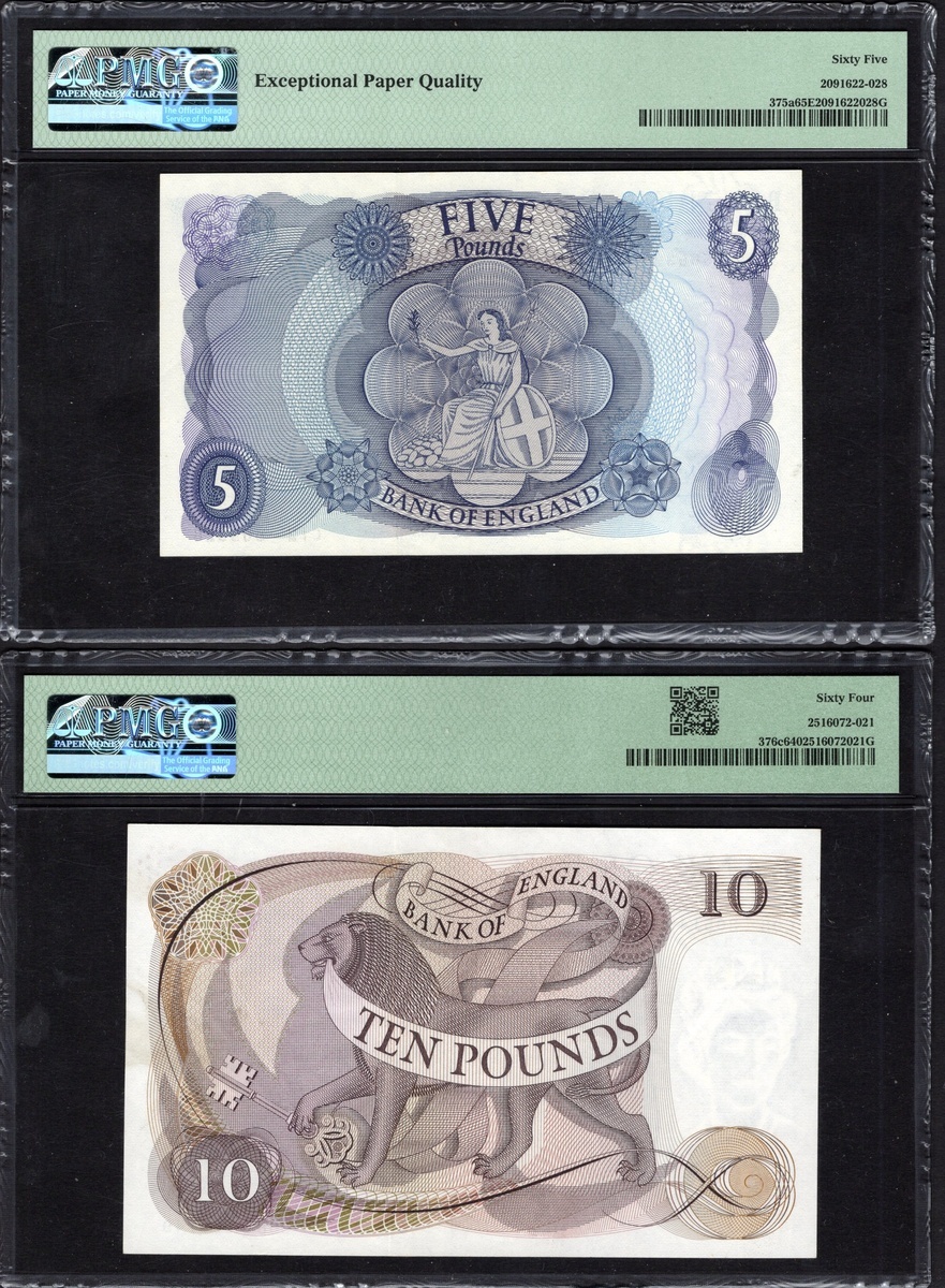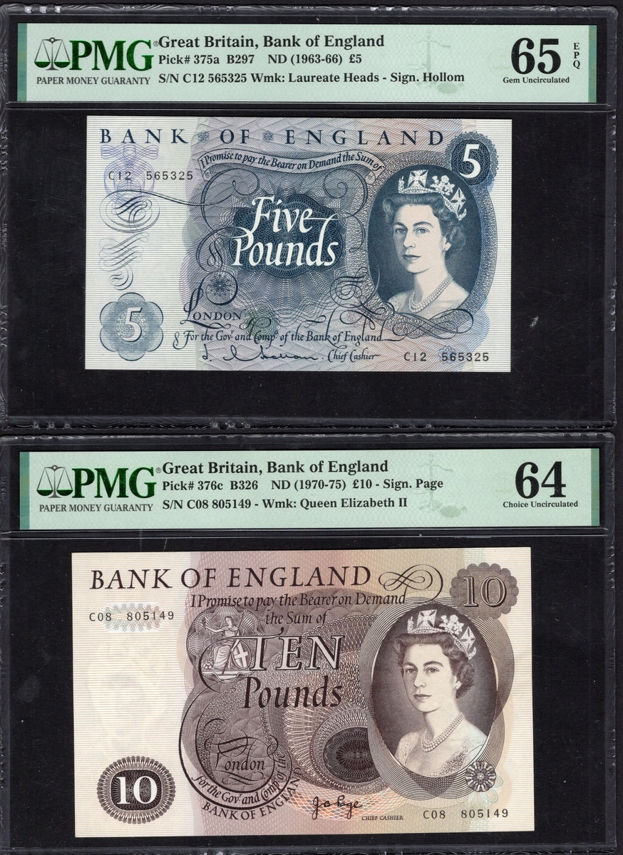 Great Britain. Bank of England. Trio: 5 Pounds. ND (1963-66). P-375a (2). Portrait of Queen Elizabeth II at right. Consecutive numbers. Both PMG Gem Uncirculated 65 EPQ; and 10 Pounds. ND (1970-75). P-376c. PMG Choice Uncirculated 64. [3]
