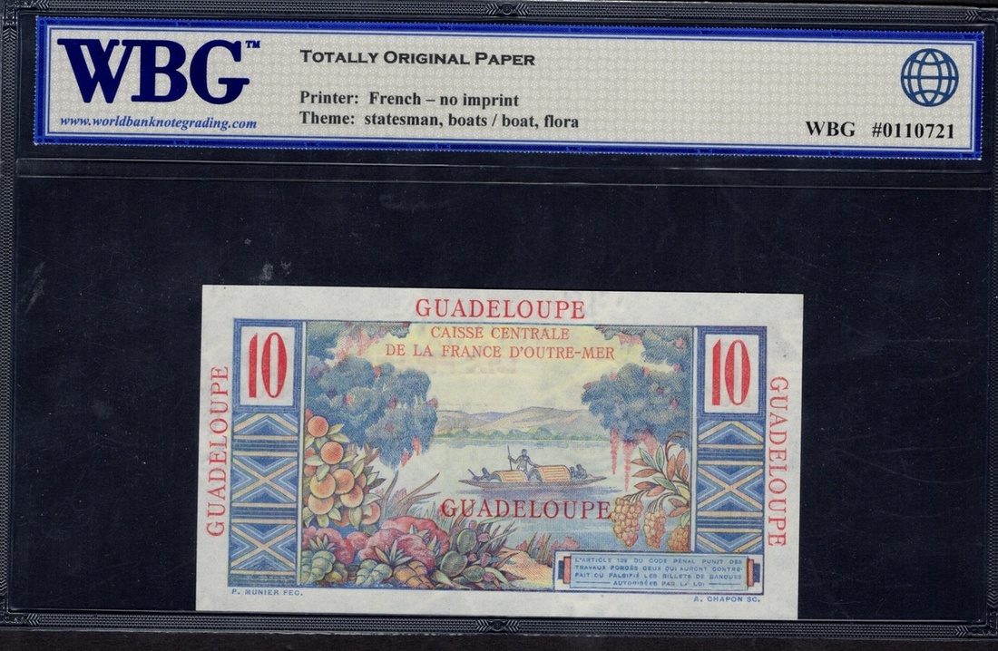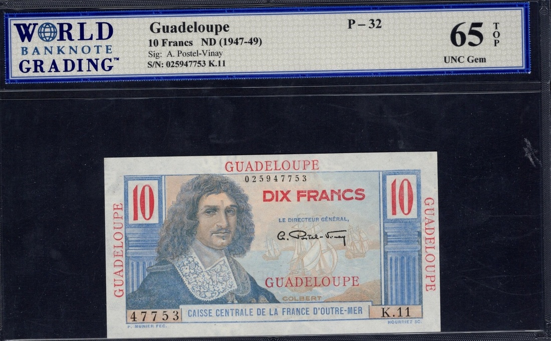 Guadeloupe. Caisse Centrale de la France d'Outre-Mer. 10 Francs. ND (1947-49). P-32. No. 025947753. Multicolor. Colbert at left, sailing ships right; covered canoe and foliage on back. WBG Unc Gem 65 TOP.