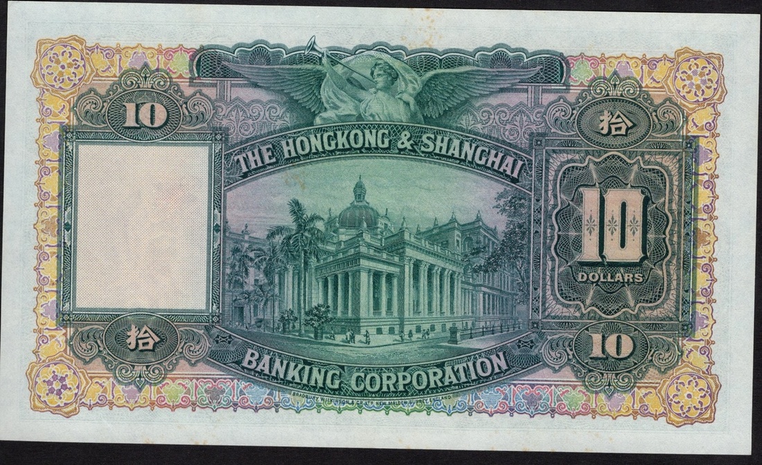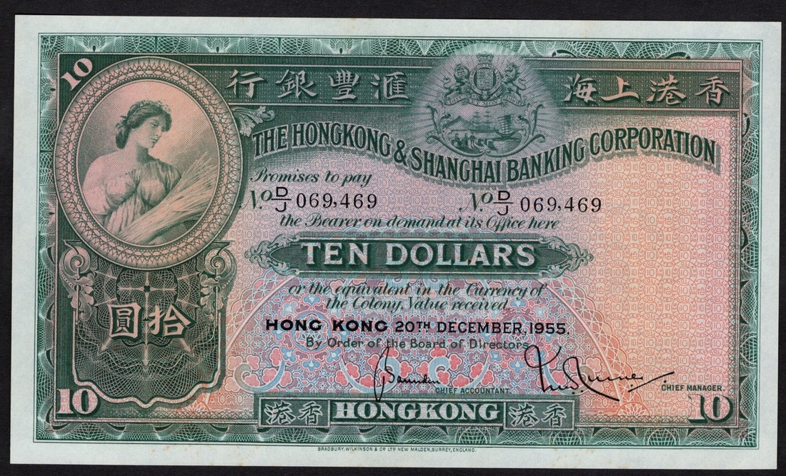 Hong Kong. Hong Kong and Shanghai Banking Corporation 10 Dollars. 20 December 1955. P-179Ab. No. D/J 069, 469. Green on multicolor. Woman with sheaf of grain at upper left; original HSBC building at center, angel sounding clarion above. Faint paperclip impression upper edge, very minor stain. AU.