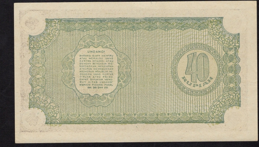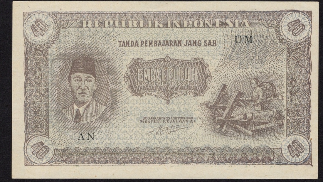 Indonesia. Republik Indonesia. 40 Rupiah. 23 August 1948. P-33. Gray and lilac. Sukarno at left, weaver at loom right. Crisp Uncirculated.