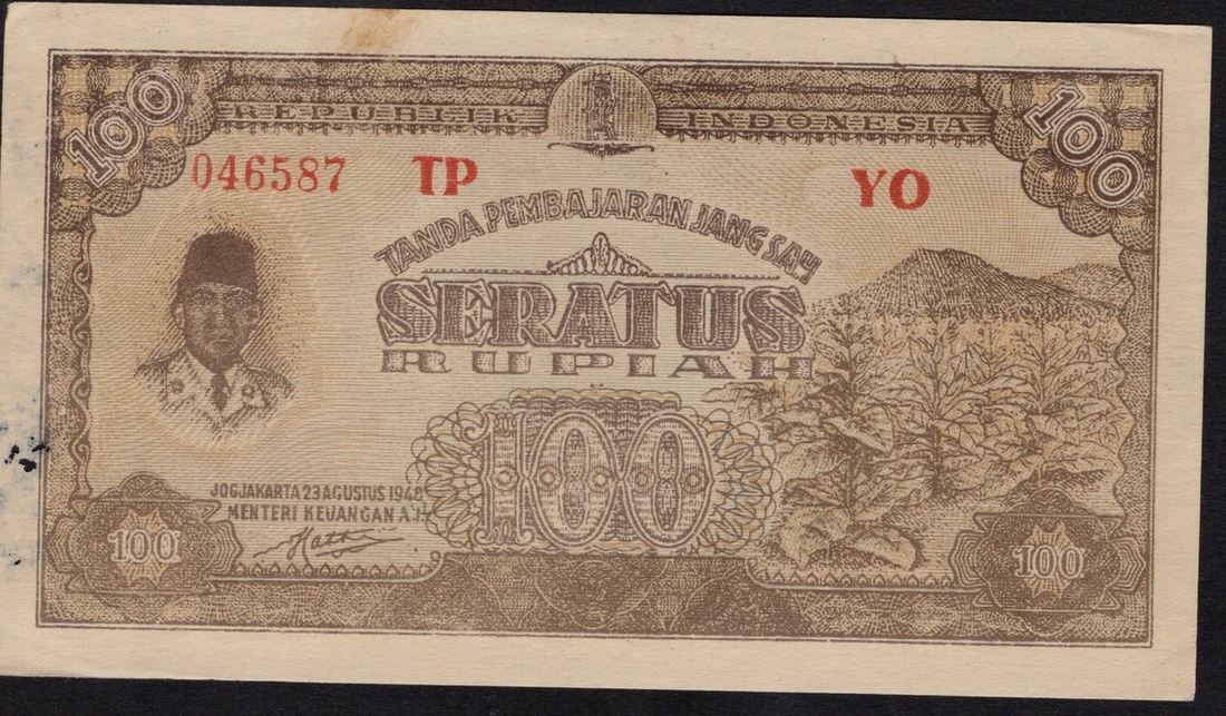 Indonesia. Republik Indonesia. 100 Rupiah. 23 August 1948. P-34. No. 046587 TP YO. Brown; orange-red and pale violet back. Sukarno at left, tobacco field at right. Staple holes left margin. Very Fine.
