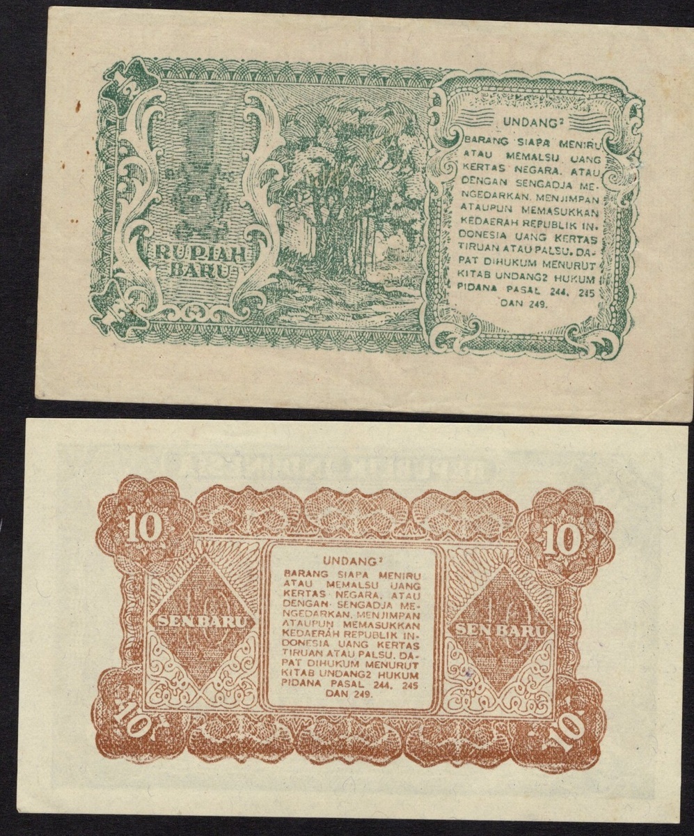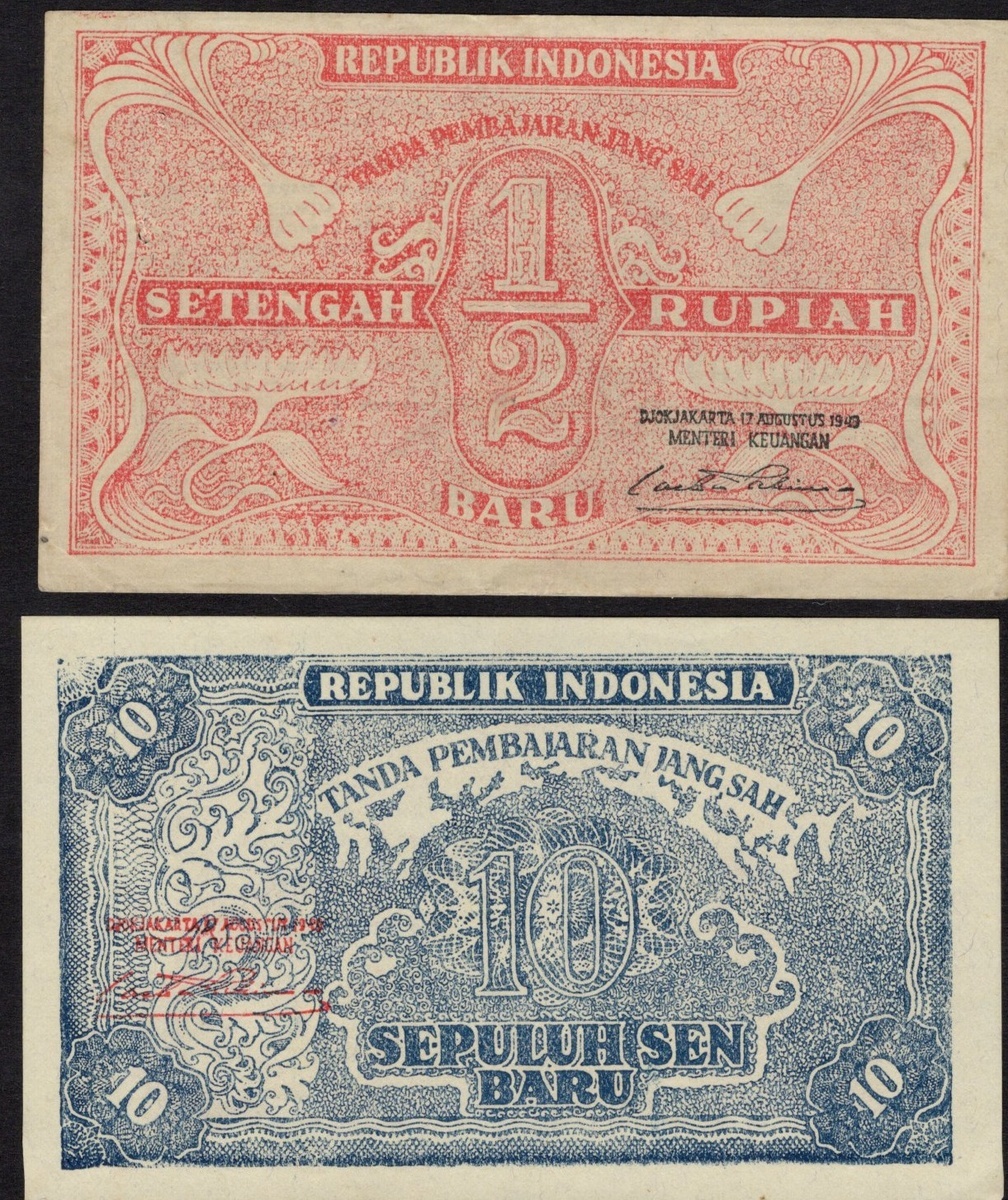 Indonesia. Republik Indonesia. 10 New Cents and ½ Rupiah. 17 August 1949. P-35Ba, 35Cb. Revaluation Issue. Dark blue; Red. Crisp Uncirculated. [2]