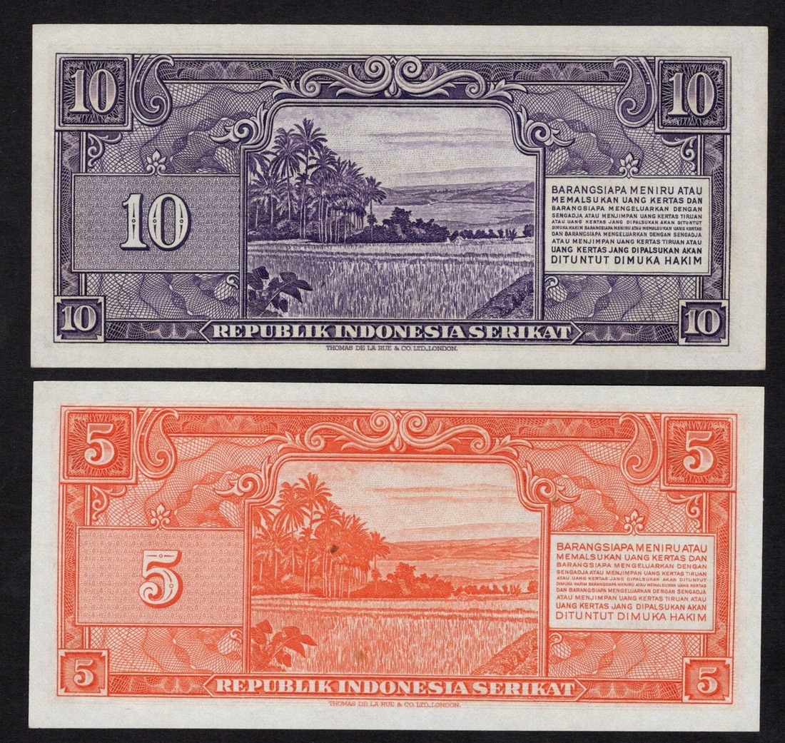 Indonesia. Republik Indonesia Serikat. Treasury. 5 and 10 Rupiah. P-37, 37a. Orange on pale green; Purple on pale green. Sukarno at right. Tiny dark adhesion on back of first. Crisp Uncirculated. [2]
