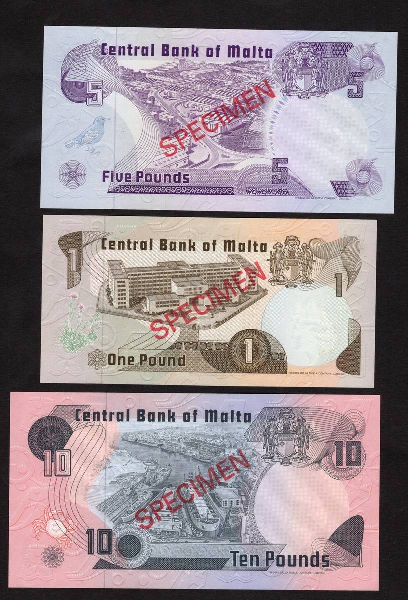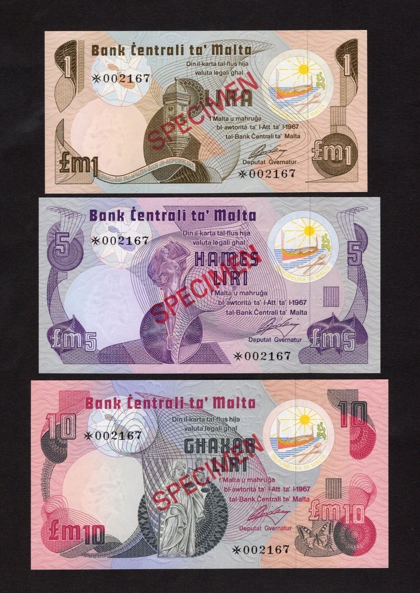 Malta. Bank Centrali ta' Malta. Specimen 1, 5 and 10 Liri, nd (1979. P-CS1. Collector Series. Uncirculated. [3]