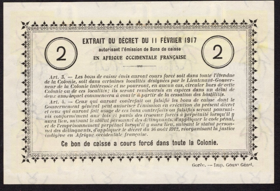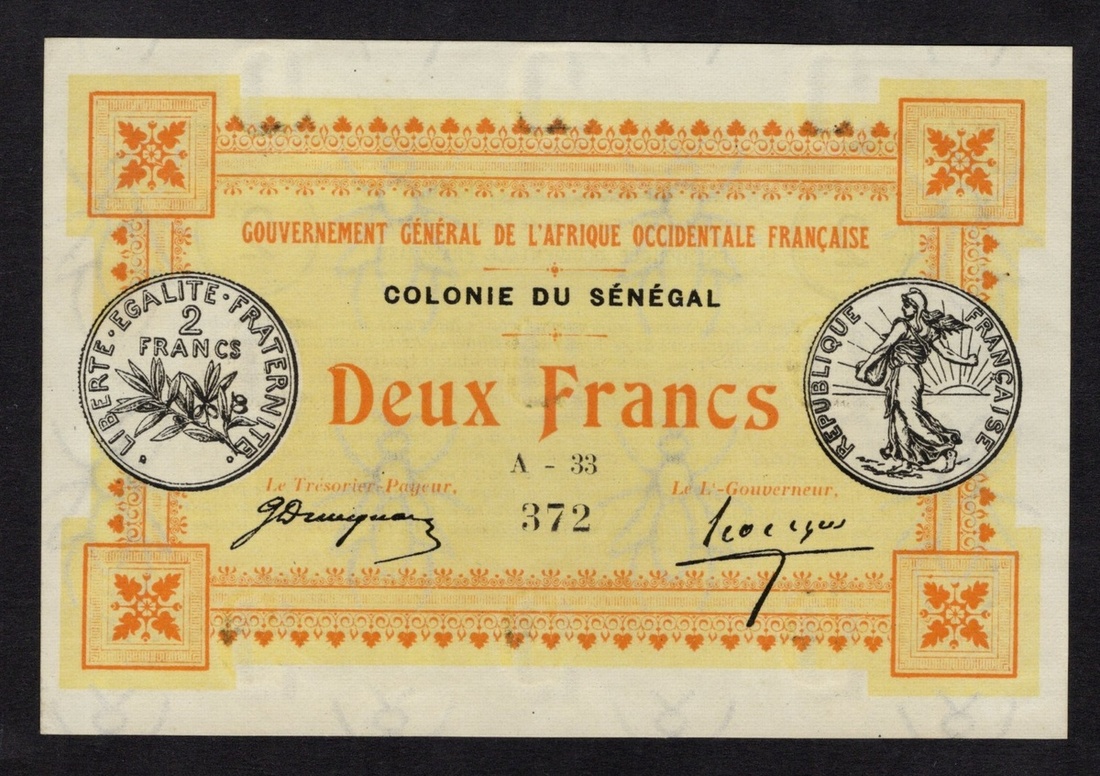 Senegal. Gouvernement Général de l'A.O.F. Colonie du Sénégal. 2 Francs. L.1917. P-3b. No. A-33 372. Orange on yellow. Obverse and reverse of a Sower 2 Francs coin. Choice AU.