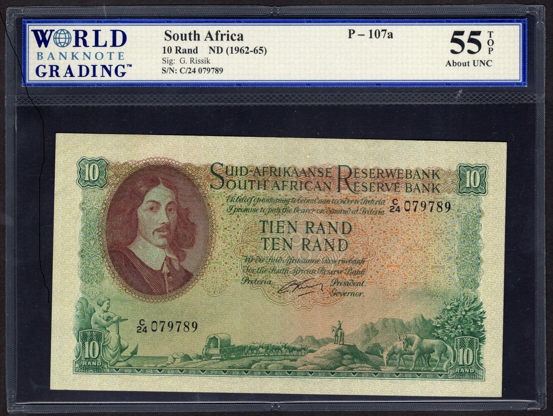 South Africa. South African Reserve Bank. 10 Rand. ND (1961). P-107a. Green and brown on multicolor. Van Riebeeck portrait at left, Vortrekkers below; Dutch East India Company ship. WBG About Unc 55 TOP.