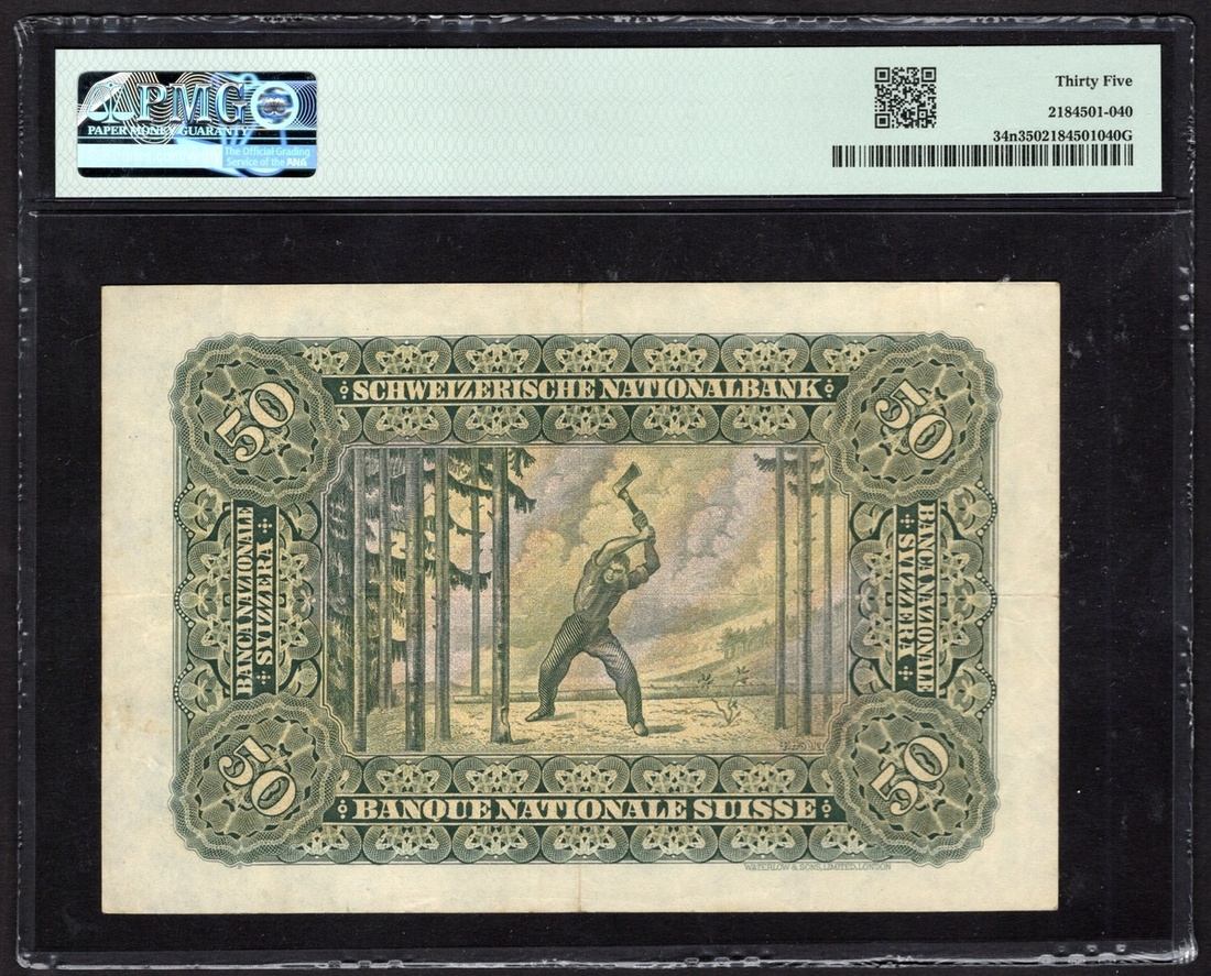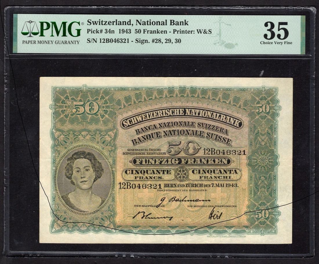 Switzerland. Swiss National Bank. 50 Franken. 1943. P-34n. No. 12B046321. Green and deep orange. Woman's portrait lower left; Woodcutter back center. PMG Choice Very Fine 35.