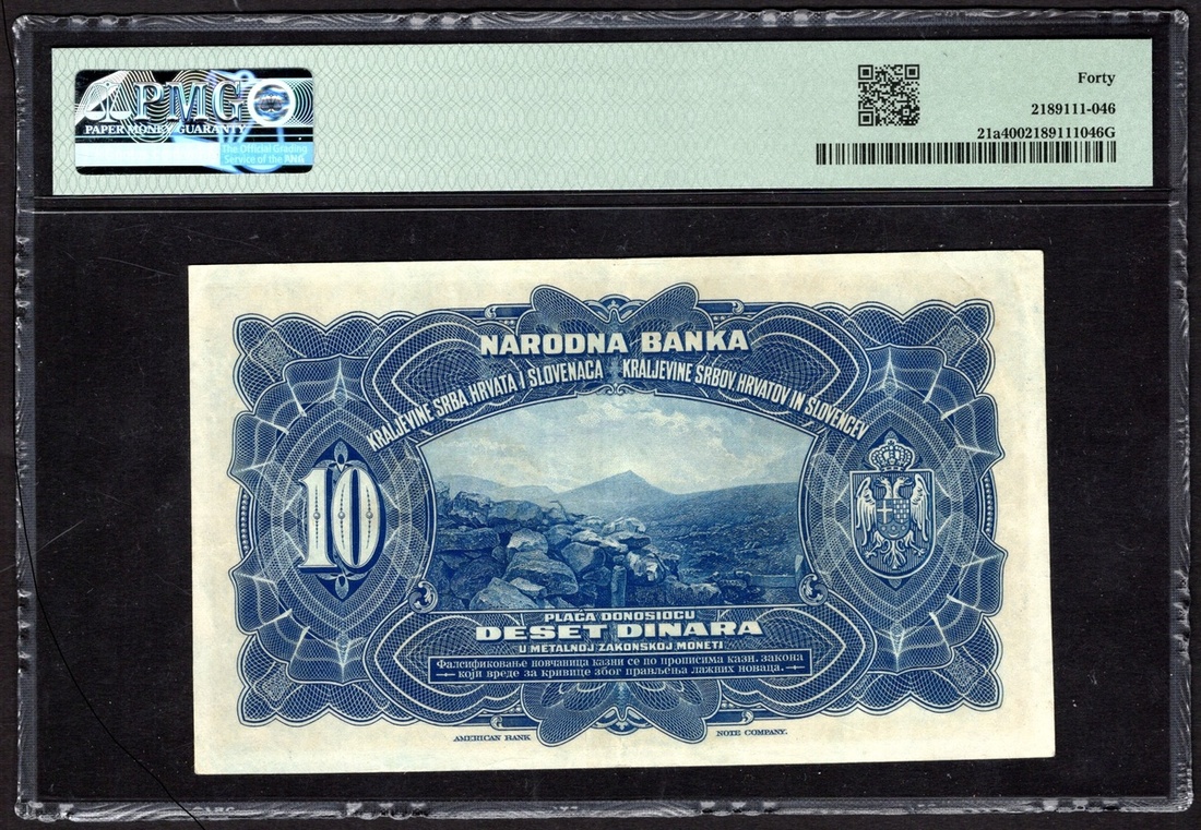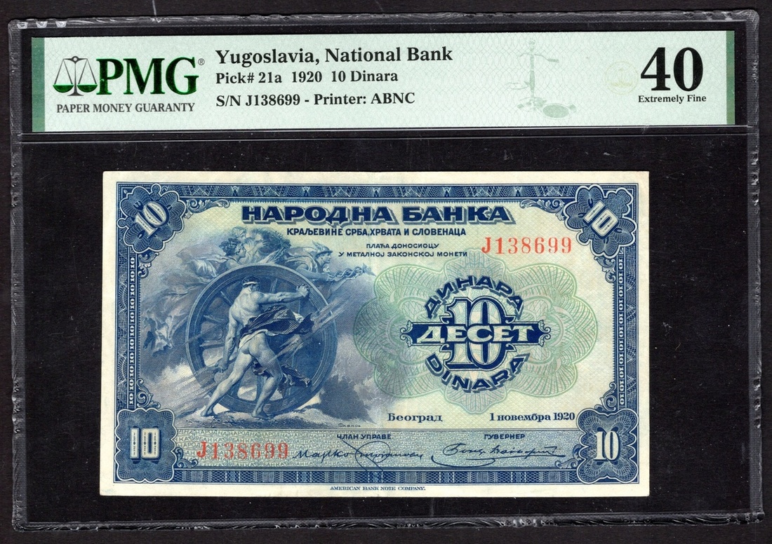 Yugoslavia. National Bank, Kingdom of Serbs, Croats and Slovenes. 10 Dinara. 1920. P-21a. No. J138699. Blue on green and pale green. "Progress" (man turning wheel); pile of rocks and mountains on back. PMG Extremely Fine 40.