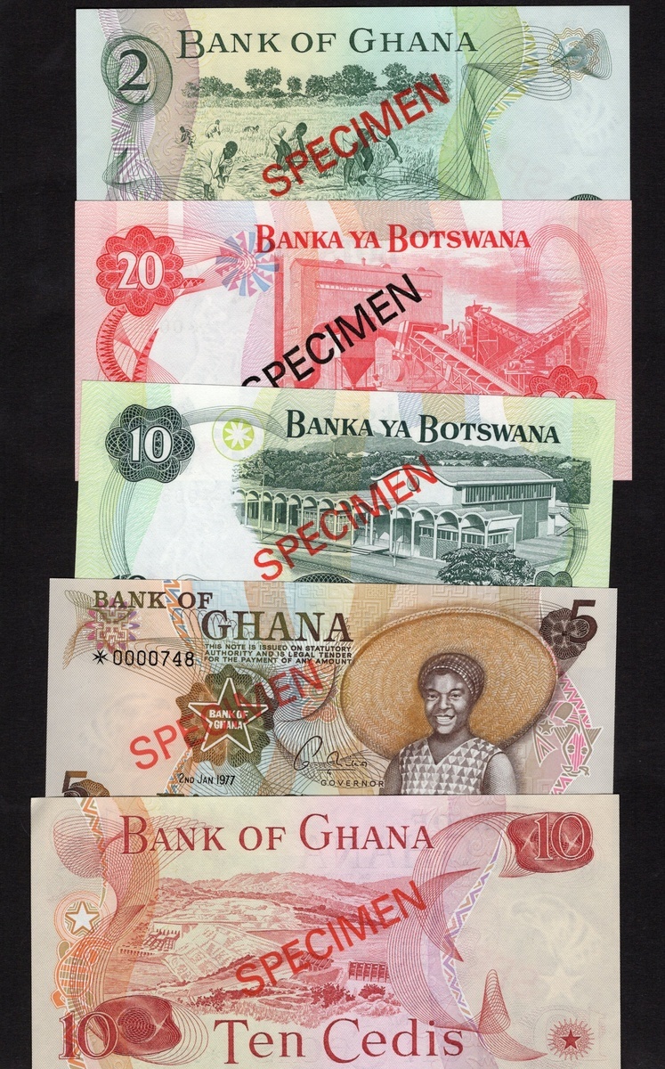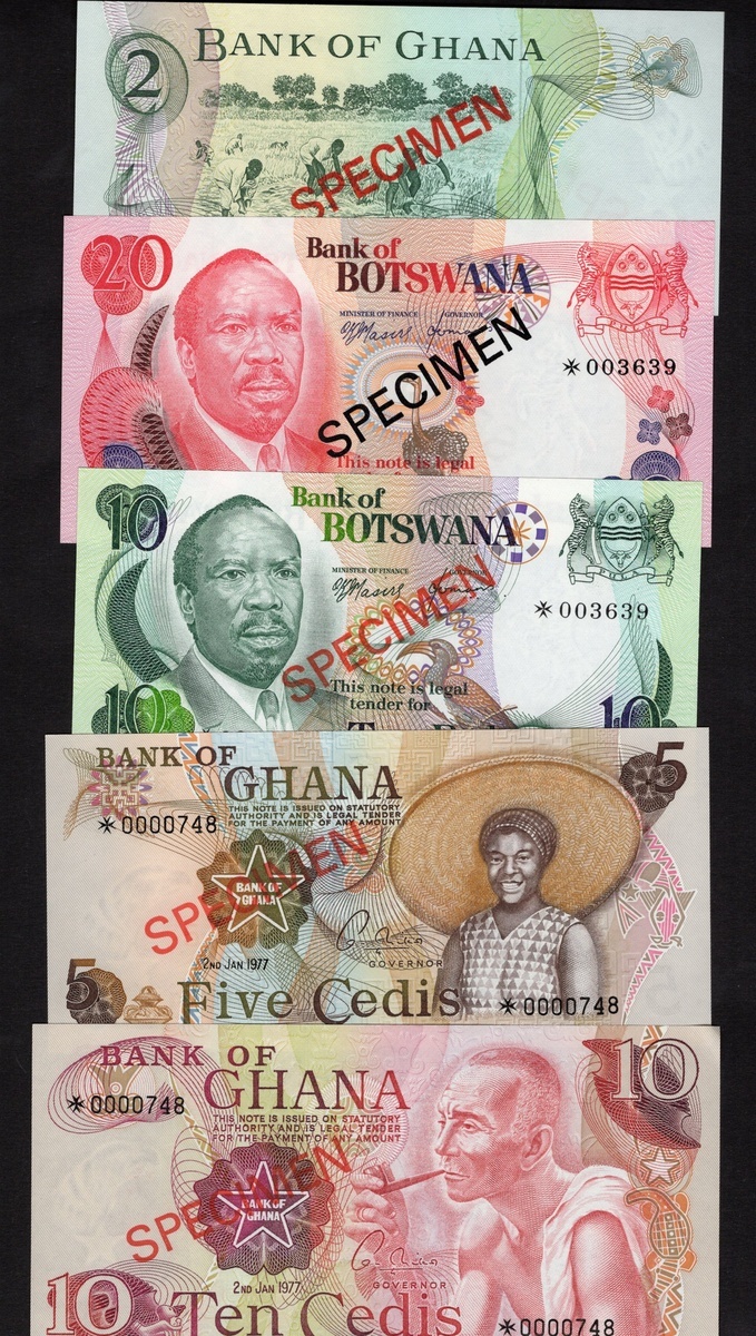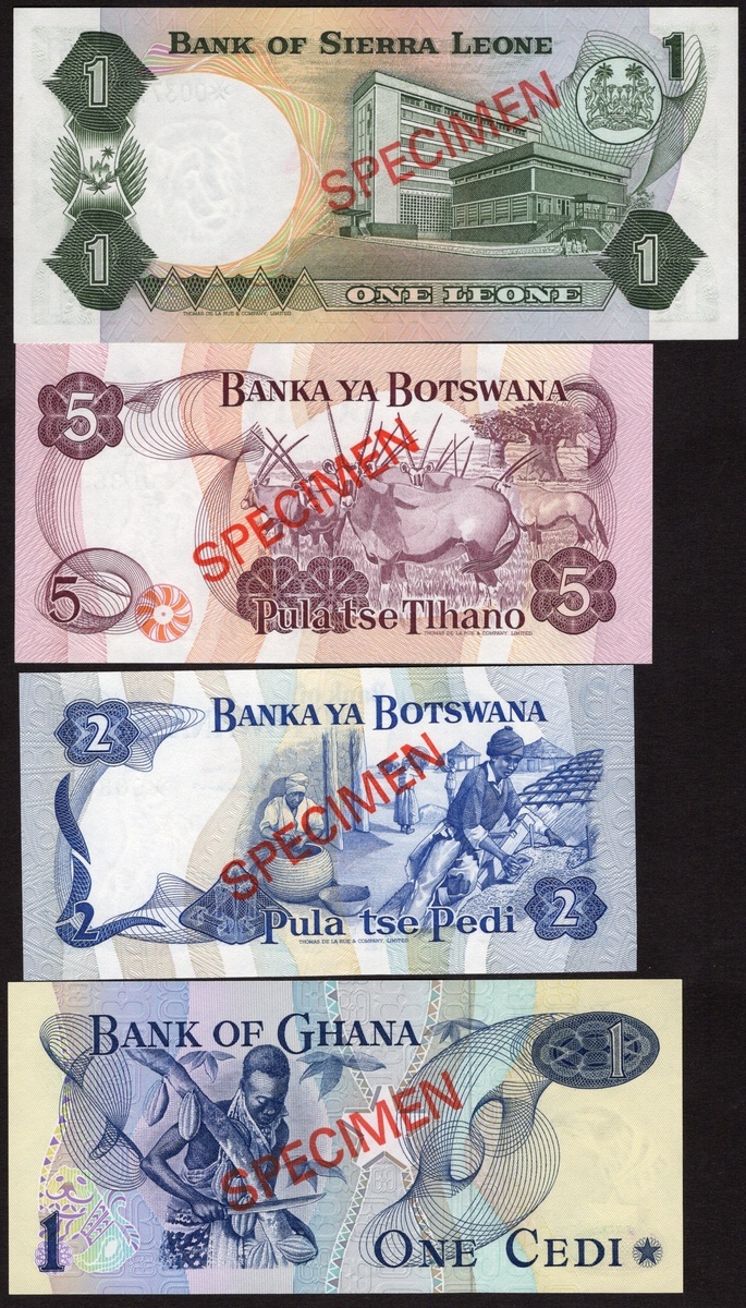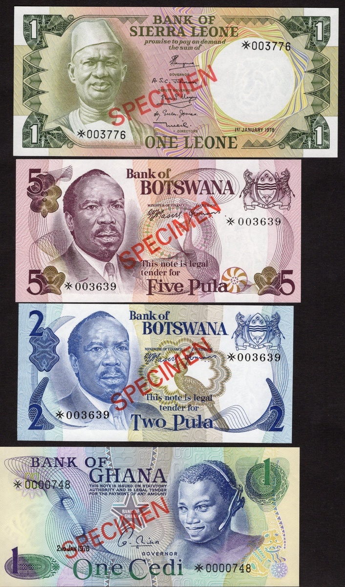 Group of African Collector Series Sets: Botswana. Bank of Botswana. Specimen 1, 2, 5, 10 and 20 Pula, nd (1979). P-CS1; Ghana. Bank of Ghana. Specimen 1, 2, 5 and 10 Cedis, 1977. P-CS1; Sierra Leone. Bank of Sierra Leone. Specimen 50 Cents, 1 Leone, 2 and 5 Leones, nd (1979). P-CS2; Swaziland. Monetary Authority. Specimen 1, 2, 5, 10 and 20 Emalangeni, nd (1974). P-CS1. Uncirculated. [18]