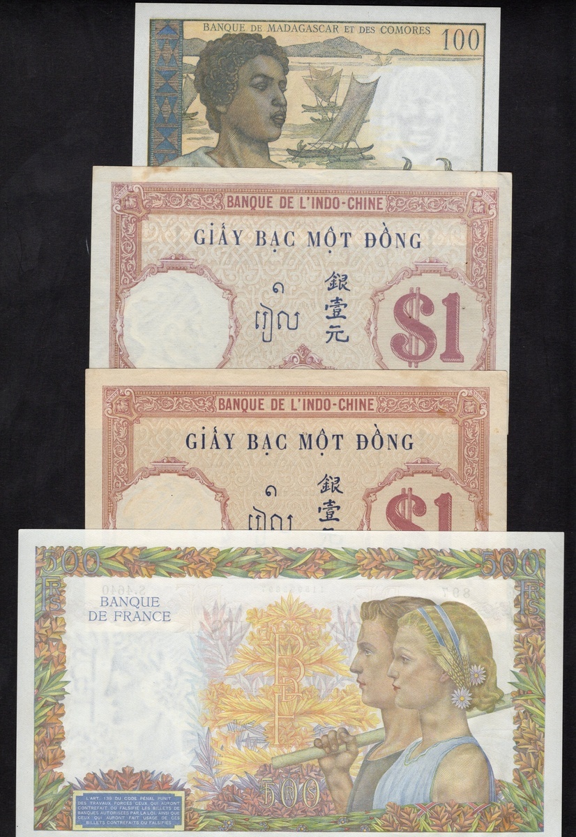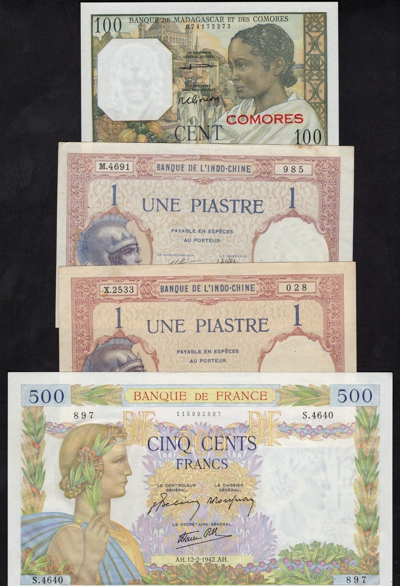 France and Colonial Group. France. Banque de France. 500 Francs. 12-2-1942. P-95b. AU; Comoros. Banque de Madagascar et des Comores. 100 Francs. ND (1963). P-3b. Red COMORES o/p on Madagascar. Uncirculated; and French Indo-China. Banque de l'Indo-Chine. 1 Piastre. ND (1921-26; 1927-31). P-48a, b. EF, AU. [4]