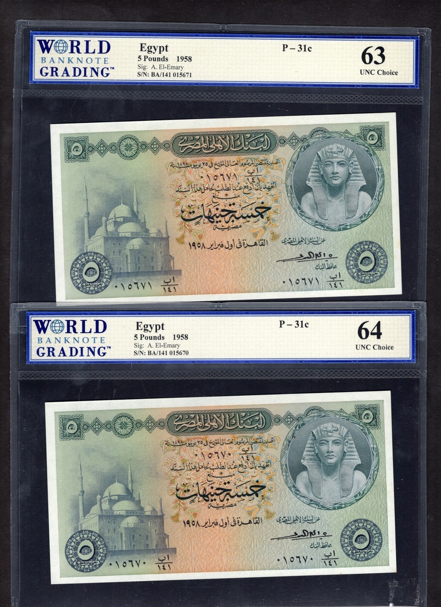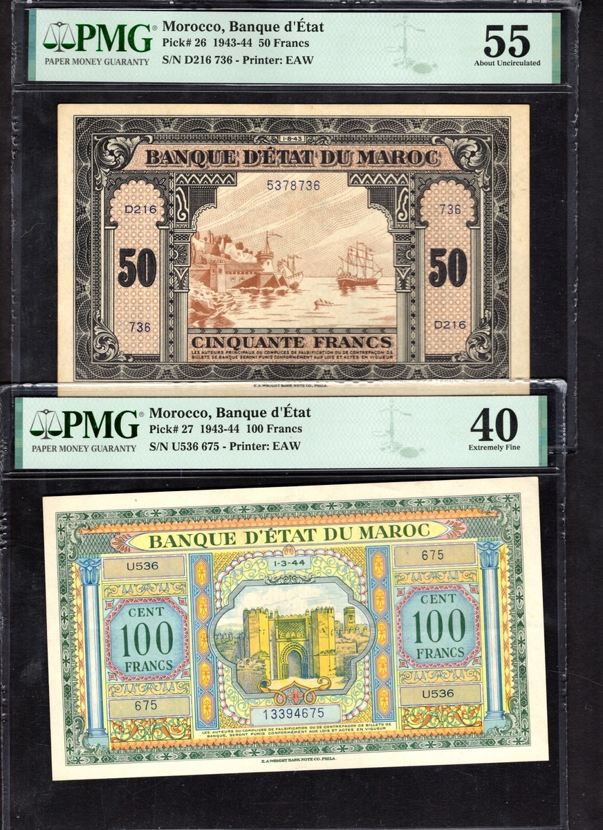 Morocco and Egypt graded Lot. Morocco. Banque d'État du Maroc. 50 Francs. 1943. P-26. PMG About Uncirculated 55; 100 Francs. 1944. P-27. PMG Extremely Fine 40; Egypt. National Bank. Consecutive pair of 5 Pounds. 1958. P-31c. WBG Unc Choice 64, and Unc Choice 63. [4]