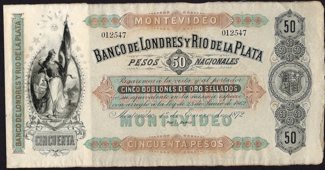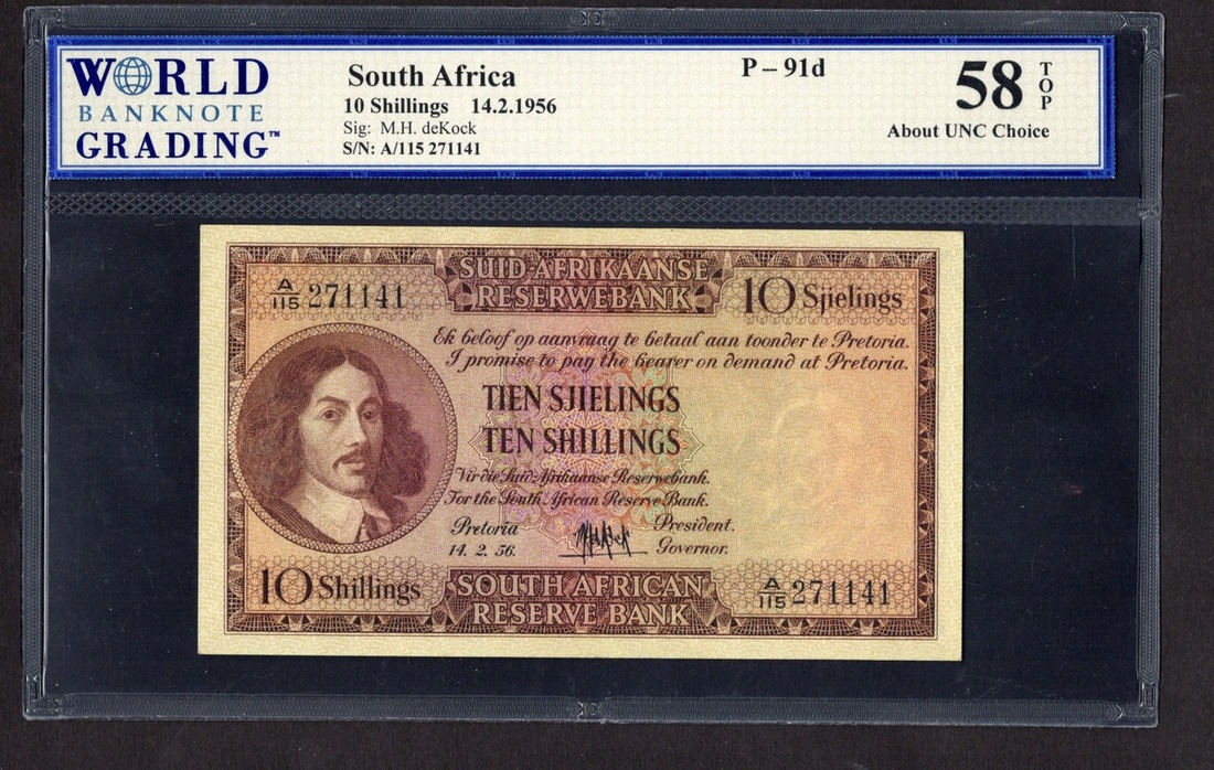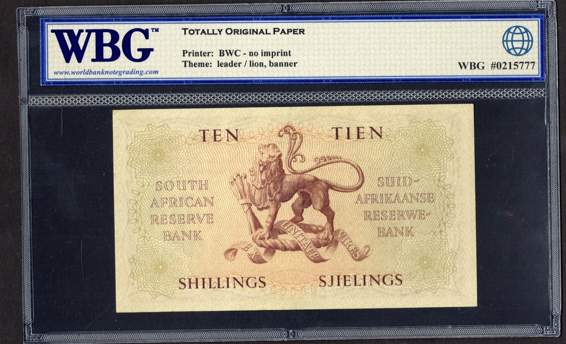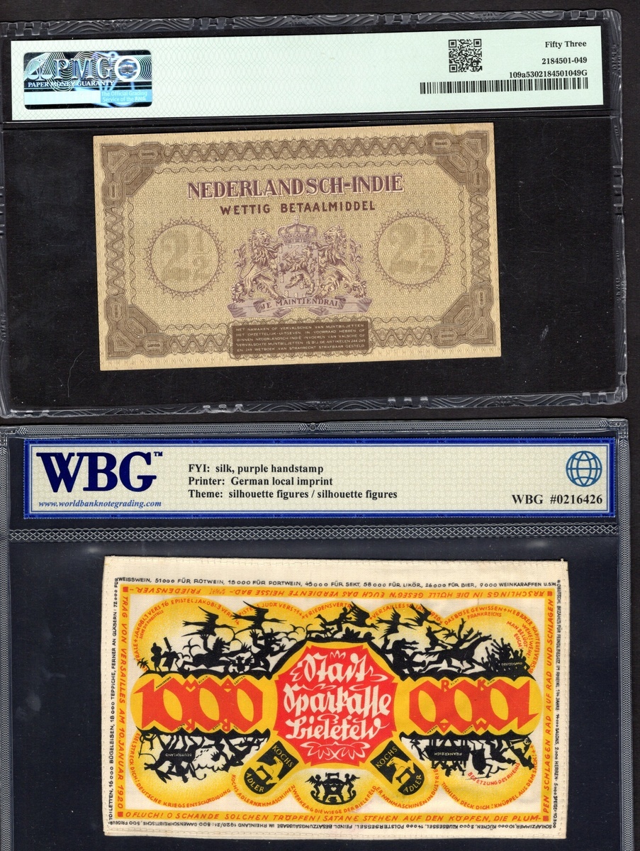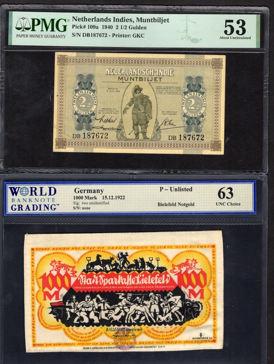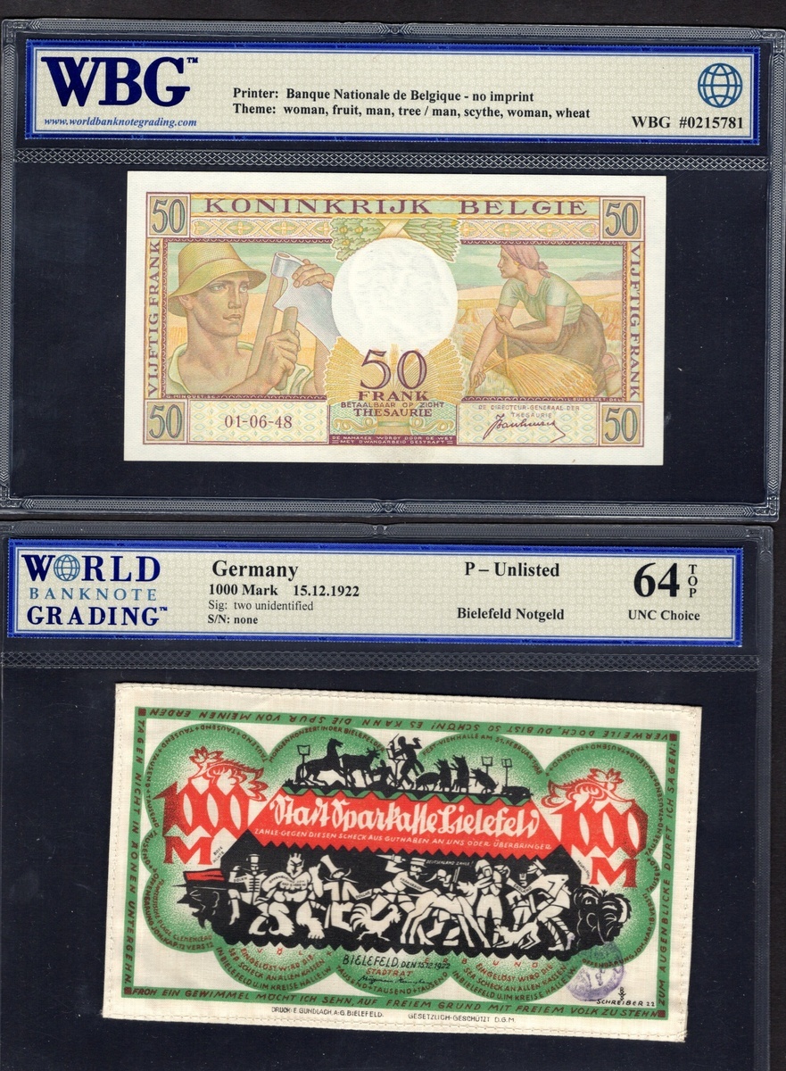 World Graded Banknote Lot. Belgium. 50 Francs. 1948. P-133a. WBG Unc Choice 64; Germany. Bielefeld Notgeld. 1000 Mark. 1922. Linen. Black, green and red. WBG Unc Choice 64 TOP, Silk. Black, yellow and red. WBG Unc Choice 63; Netherlands East Indies. 2 ½ Gulden. 1940. P-109a. PMG About Unc 53; and South Africa. 10 Shillings. 1956. P-91d. WBG About Unc Choice 58 TOP; also Uruguay. Banco de Londres y Rio de la Plata. 50 Pesos. 1872. P-S238r. EF, light stain at edge. [6]