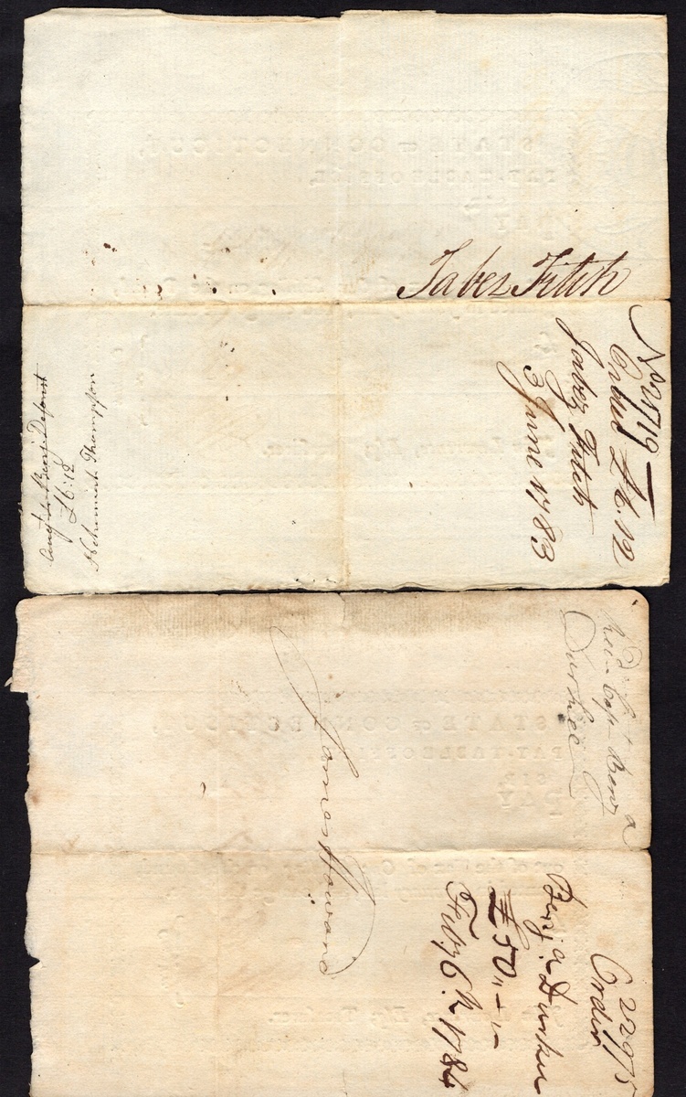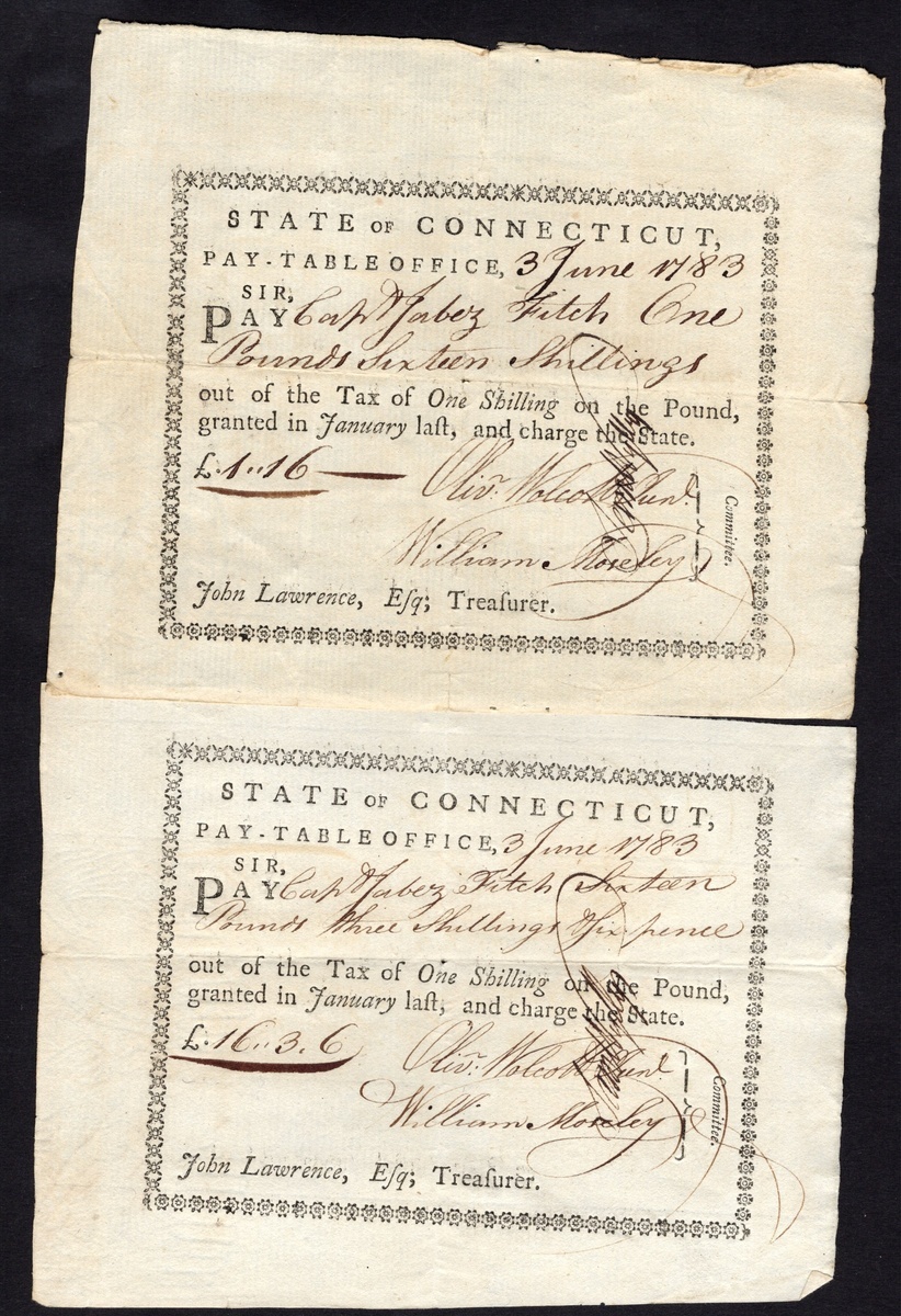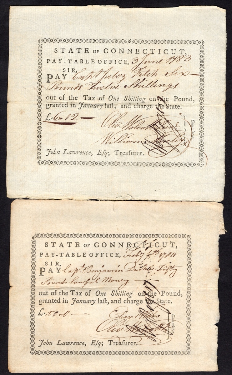 State of Connecticut. Quintet of Pay Table Office Orders for War Taxes. June 3, 1783 (4) and Feb. 6, 1784. Pay Orders in Pounds "out of the Tax of One Shilling on the Pound". All signed by Oliver Wolcott, Commissioner to mediate claims between the United States and the State of Connecticut, later U.S. Secretary of the Treasury under George Washington, and John Adams, 1795-1800, and Governor of Connecticut, 1817-1827. One with tear into upper border, Very Fine. [5]