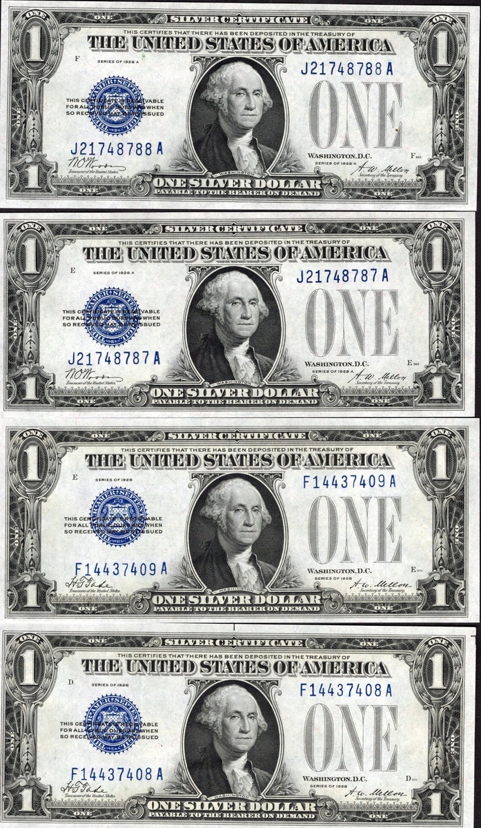 Fr.1600, 1601. Quartet of $1 Silver Certificates. 1928 (2, consecutive), Uncirculated; and 1928-A (2, consecutive). AU. [4]