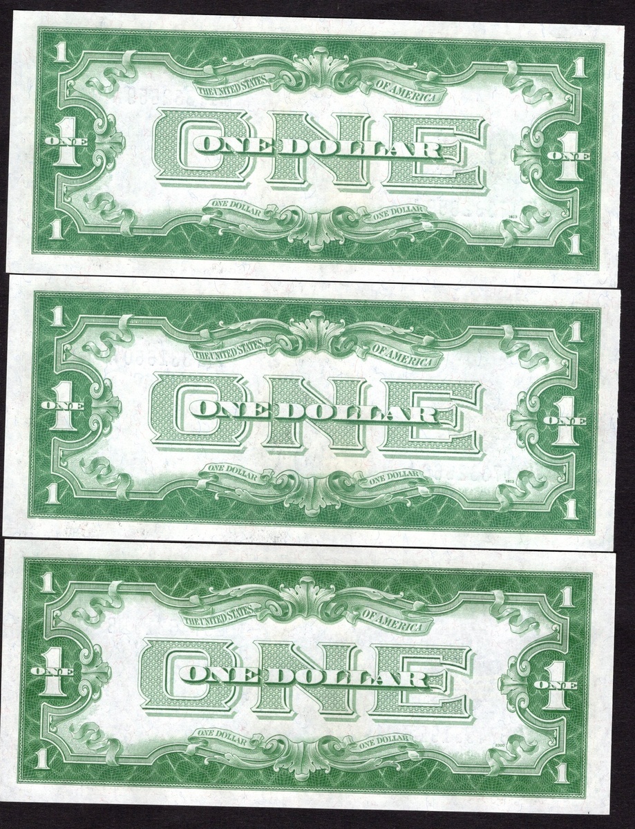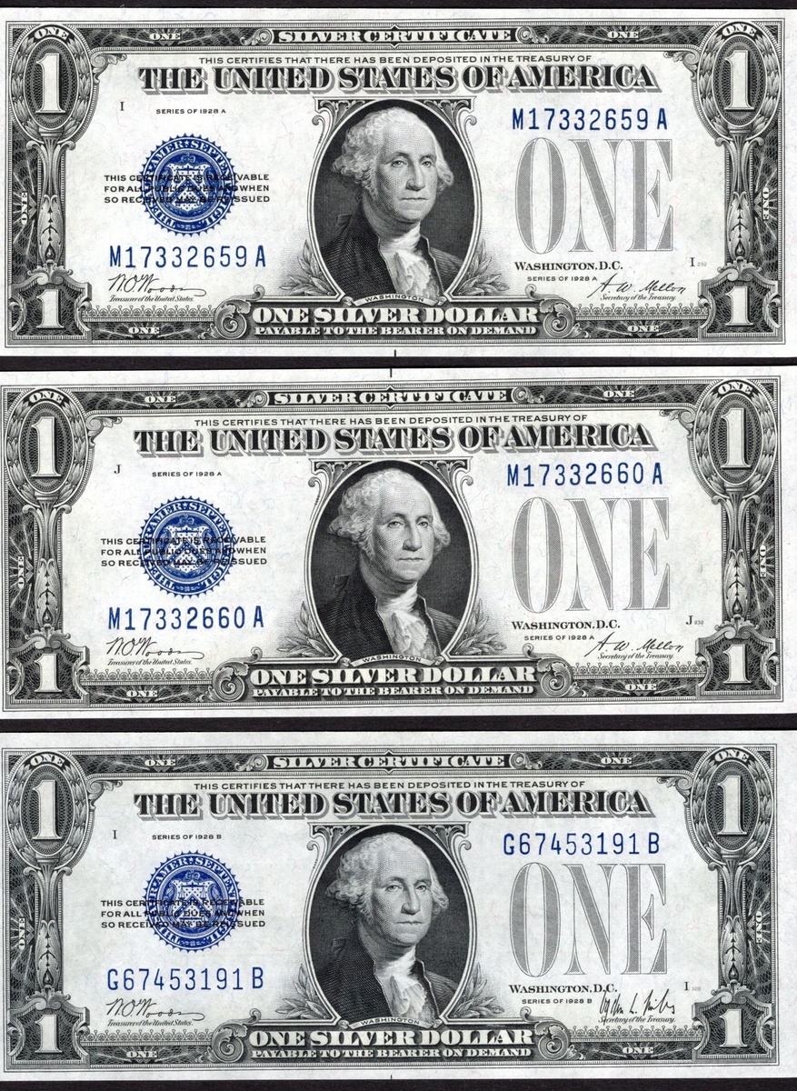 Fr.1601, 1602. Trio of $1 Silver Certificates. 1928-A (2, consecutive); and 1928-B. Uncirculated. [3]