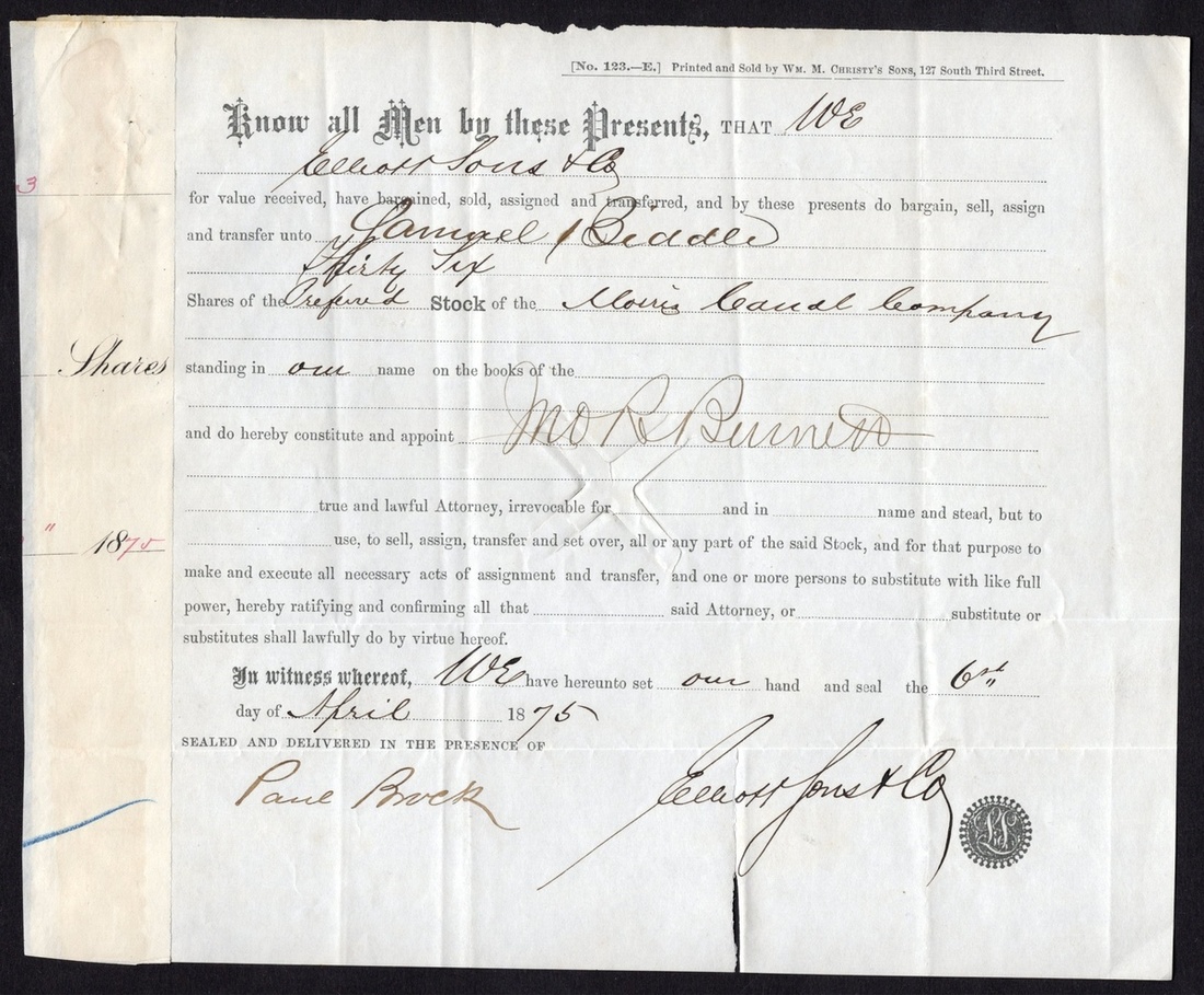 Trio of New York City-related Stocks and Bonds. Water Stock of the City of New York, $1000, April 11, 1842. City-Arms left and ribbon banner with trident and winged pole above. Signed by the Mayor Robert H. Morris; Revenue Bonds of the City of New York, $10,000, Dec.1, 1858. City-Arms below, yellow blind embossed seal lower left. Signed by the Mayor Daniel F. Tiemann; Kings. Queens and Suffolk Company. One Share, no. 952, Oct.3, 1895. Eagle vignette; also Transfer receipt for 36 Shares of stock in the Morris Canal Co., April 6, 1875. Very Fine. [4]