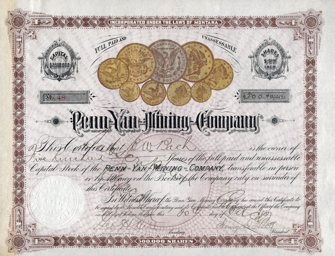 Penn-Yan-Mining Co. (MT). 1887. Certificate for 500 Shares. No. 48. Brown Obverses and reverses of a Liberty Head $20, $10, $5 and $2 ½ and the reverse of a Morgan Dollar in gold and silver metallic ink. The Penn-Yan-Mining Co. was headquartered in Helena, Montana, with its mines at Wickes. The Wickes mines produced some $50 Million in gold and silver before operations stopped in the early 1890s. One of the few certificates that features U.S. gold and silver coins; rare issued. Extremely Fine.