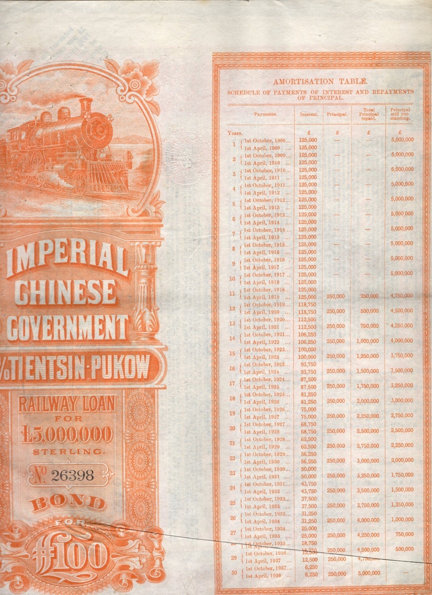 China. Trio of Imperial Railway Certificates. 1908 Imperial Chinese Government 5% Tientsin-Pukow Railway Loan. 100 Pounds, large format, orange and black. Printed by Waterlow and Sons. With all its coupons; 1911 Imperial Chinese Government 5% Hukuang Railways Gold Loan. 100 Pounds. Issued by HSBC. Large format, red and black, ornate borders, steam train at top. Pinholes, some stains in margins; and Chinese Imperial Railway, Shanghai-Nanking Railway 5% Gold Loan, July 1903. 100 Pounds. Partial front panel, some coupons. Fine-Very. (3)