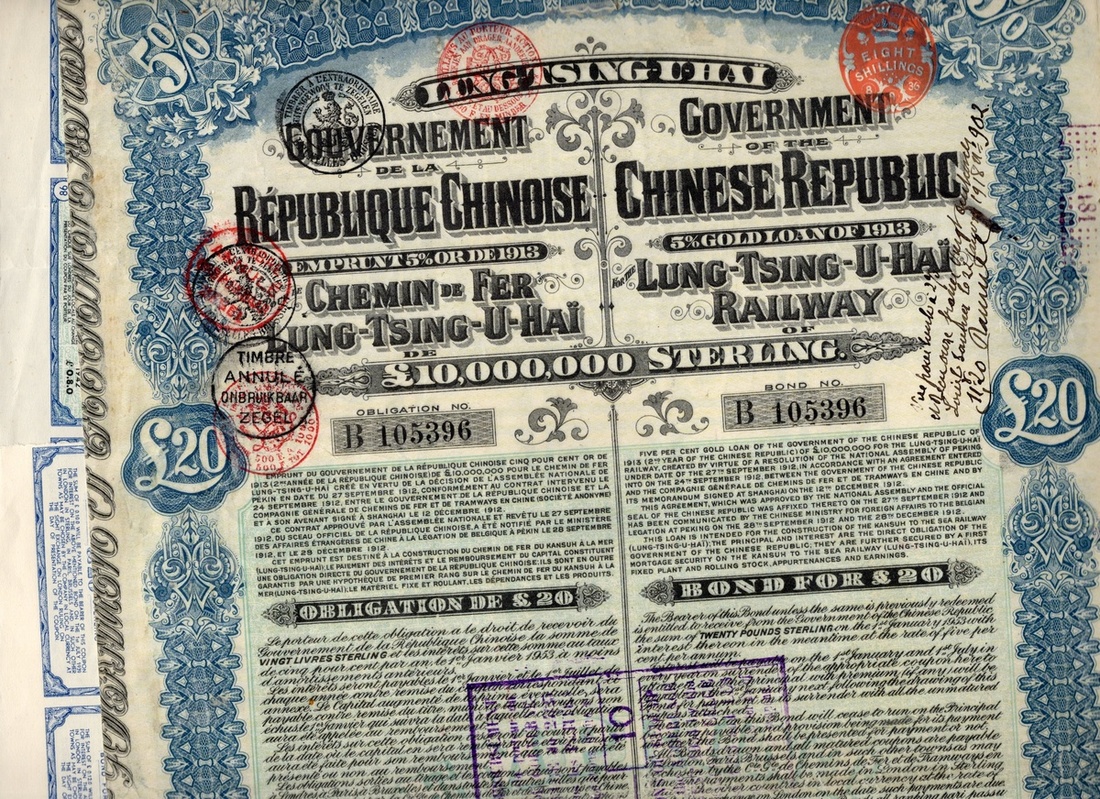 China. 1913 Lung-Tsing-U-Hai Railway 5% Gold Loan. 20 Pounds Bond. No. B105396. Vertical format, blue guilloche borders, pale green underprint; two large red seals with signatures at bottom left and right. Coupon sheet staple to bond; missing just two coupons. Central fold. Good Very Fine.