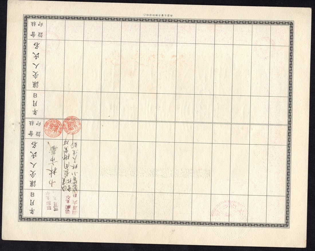 China. South Manchurian Railway Co., Ltd.. Trio of Certificates. 1 Share. Showa 8 (1933). Red border. Steaming locomotive above; and 10 Shares (2). Taisho 9 (1920) and Showa 15 (1940). Brown borders. Steaming locomotive below. EF-AU. [3]