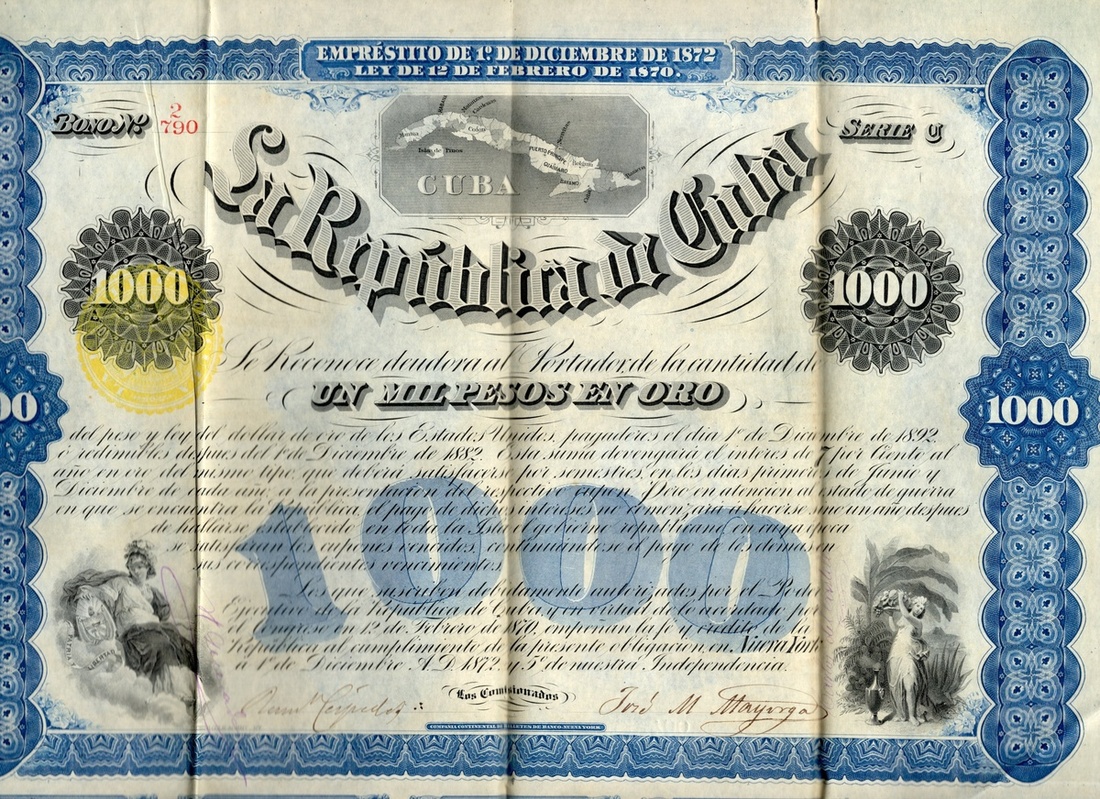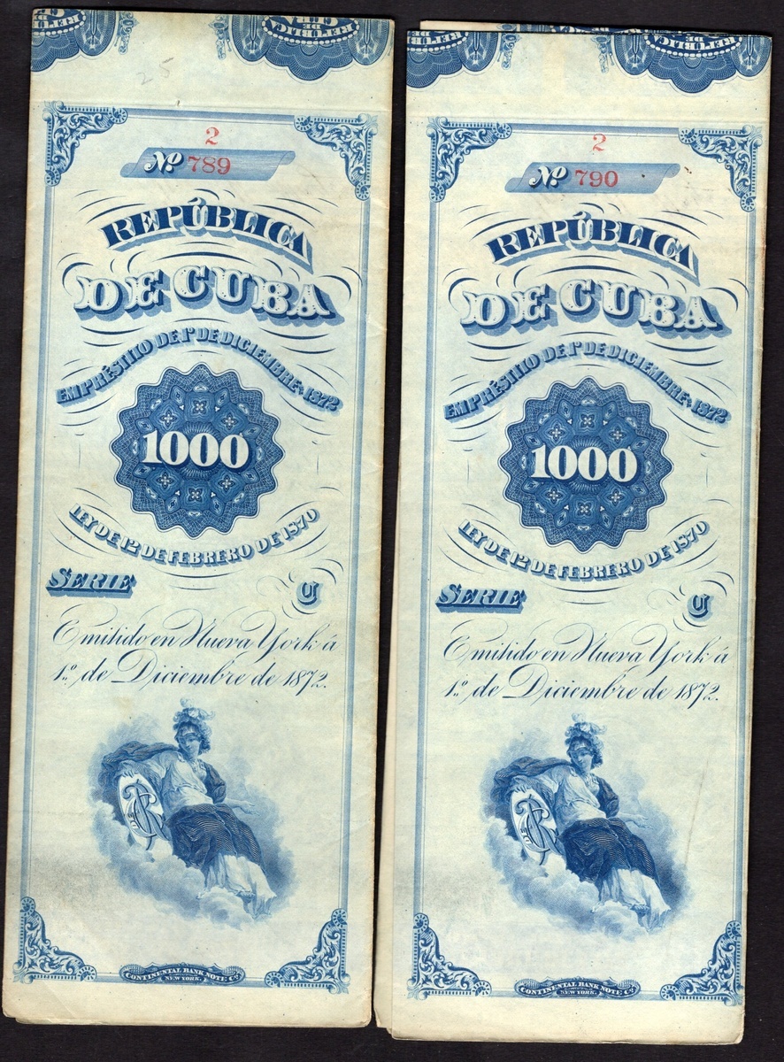Cuba. Republica de Cuba. Pair of Bonds of 1000 Pesos in Gold. 1872 (NY). No. 789 and 790. Black with blue borders, blue panels, green Republica seal. Map of Cuba top center, allegorical women bottom left and right. Missing only 3 coupons each. Multifold, the latter with diagonal cornerfold. Very Fine. [2]