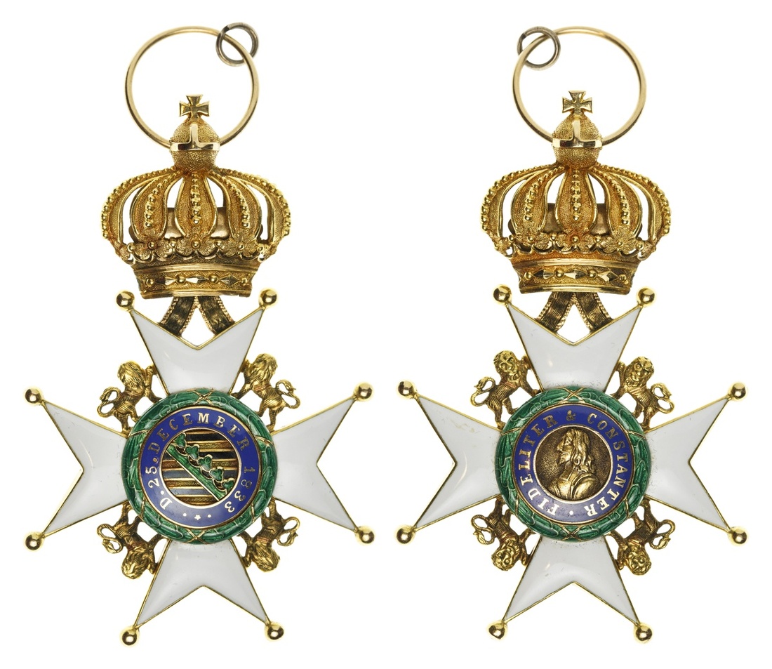 German States. Saxe-Altenburg, Saxe Coburg-Gotha and Saxe-Meiningen. Saxe-Ernestine House Order. Knight's Cross, 1st Class. 45 x 69mm (including crown suspender). Gold, gilt silver, white, green and blue enamels. Gold bust of Ernst the Pious on central medallion; Saxon Arms on back on eight-pointed, ball-tipped white enamel cross, lion in angles. Very Fine.