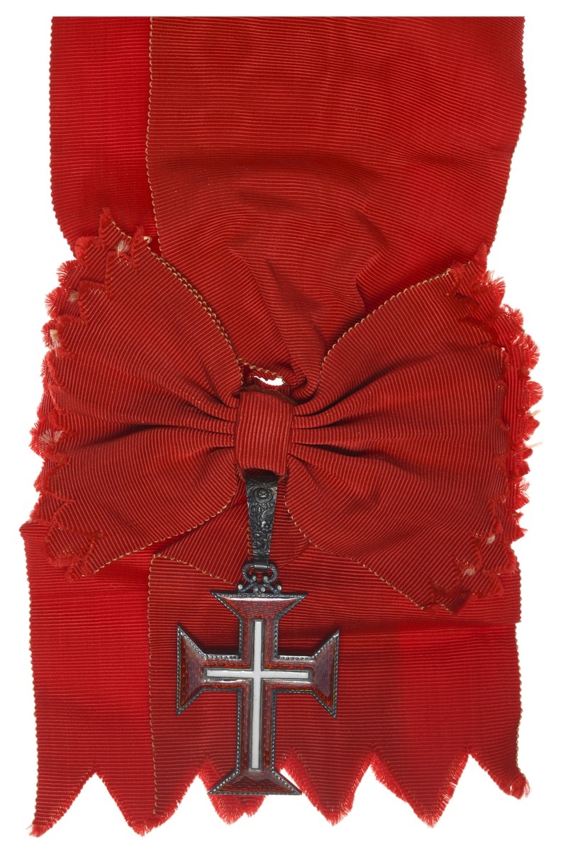Portugal. Military Order of Christ. Commander's Sash Badge. Pre-1938. 43 x 65mm (not including floral suspender). Silver, red and white enamels. On sash. Extremely Fine.