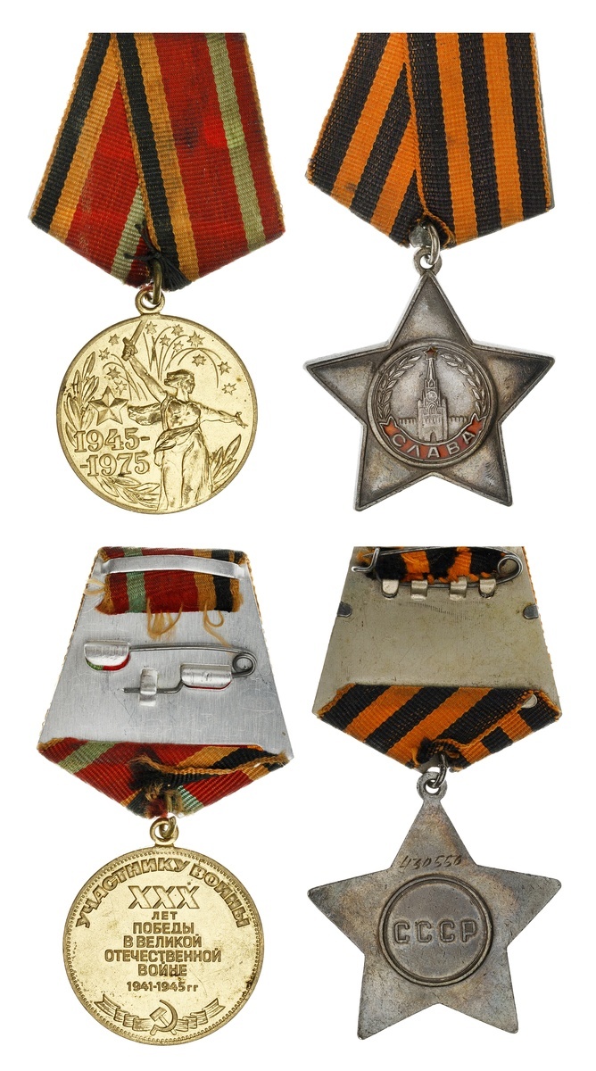 U.S.S.R. Order of Glory. 3rd Class. No. 430556. Silver with red enamel. On ribbon. Toned over reverse contact marks. About Extremely Fine; also 30th Anniversary of Victory in the Great Patriotic War Medal. Uncirculated. (2)