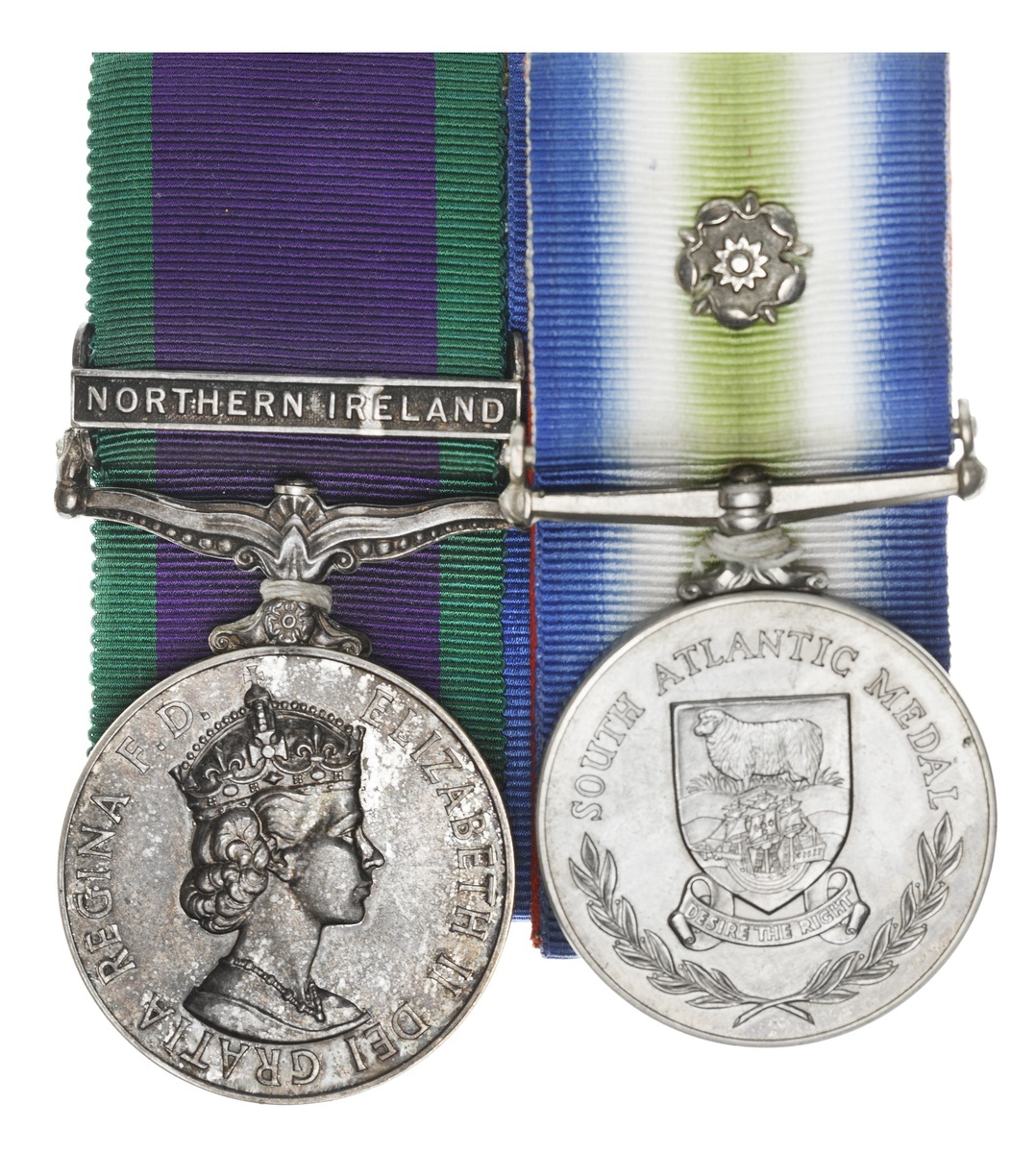 Great Britain. Falkland Islands and Northern Ireland Pair to Guardsman D. Cameron Scots Guard. General Service Medal, 1962-2007. One clasp: "Northern Ireland" and South Atlantic Medal with rosette. (24265450 GDSM D. CAMERON SG). On original ribbons. Extremely Fine-AU. With copy of Cameron's Discharge certificate, Chelsea Barracks, London, January 13, 1984.