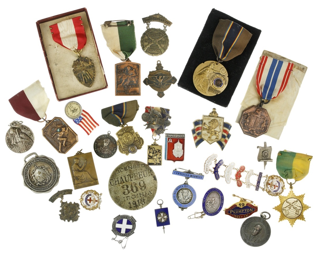 Lot of Miscellaneous small Badges. Mostly U.S. with a grouping of NYC area pieces - scholastic, sports etc., 1910-1940s, a 1913 chauffeur's badge; trio of small silver and enamel Scottish nurses badges, a Plumpton badge and other. Fine-EF. (28)