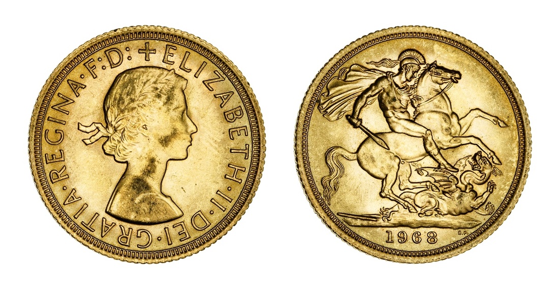 Great Britain. Elizabeth II (1952-2022). Sovereign, 1968. Young laureate head right, rev. St. George. S.4125, KM 908. Small dark area on head. Uncirculated.