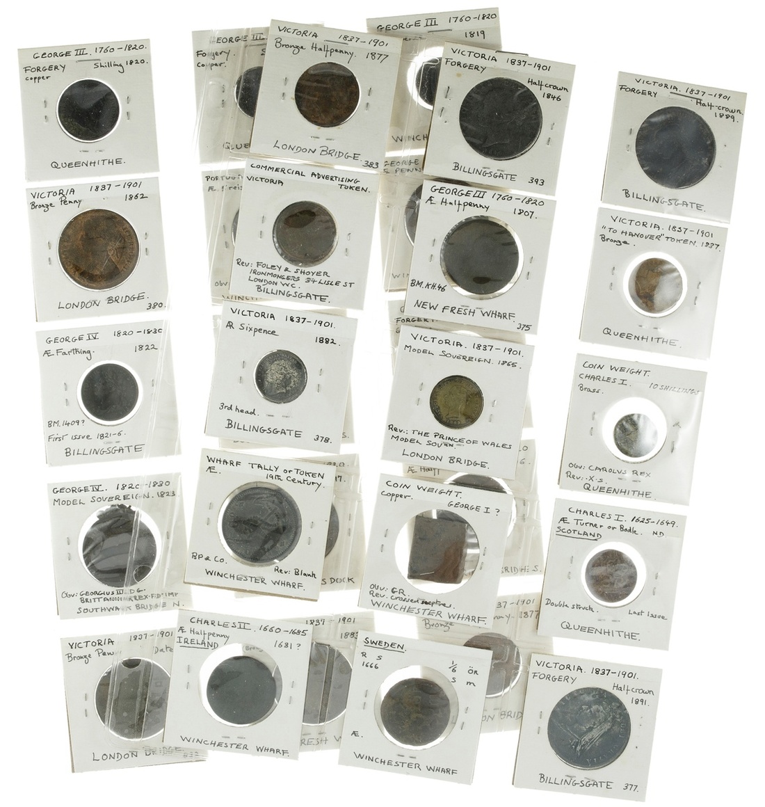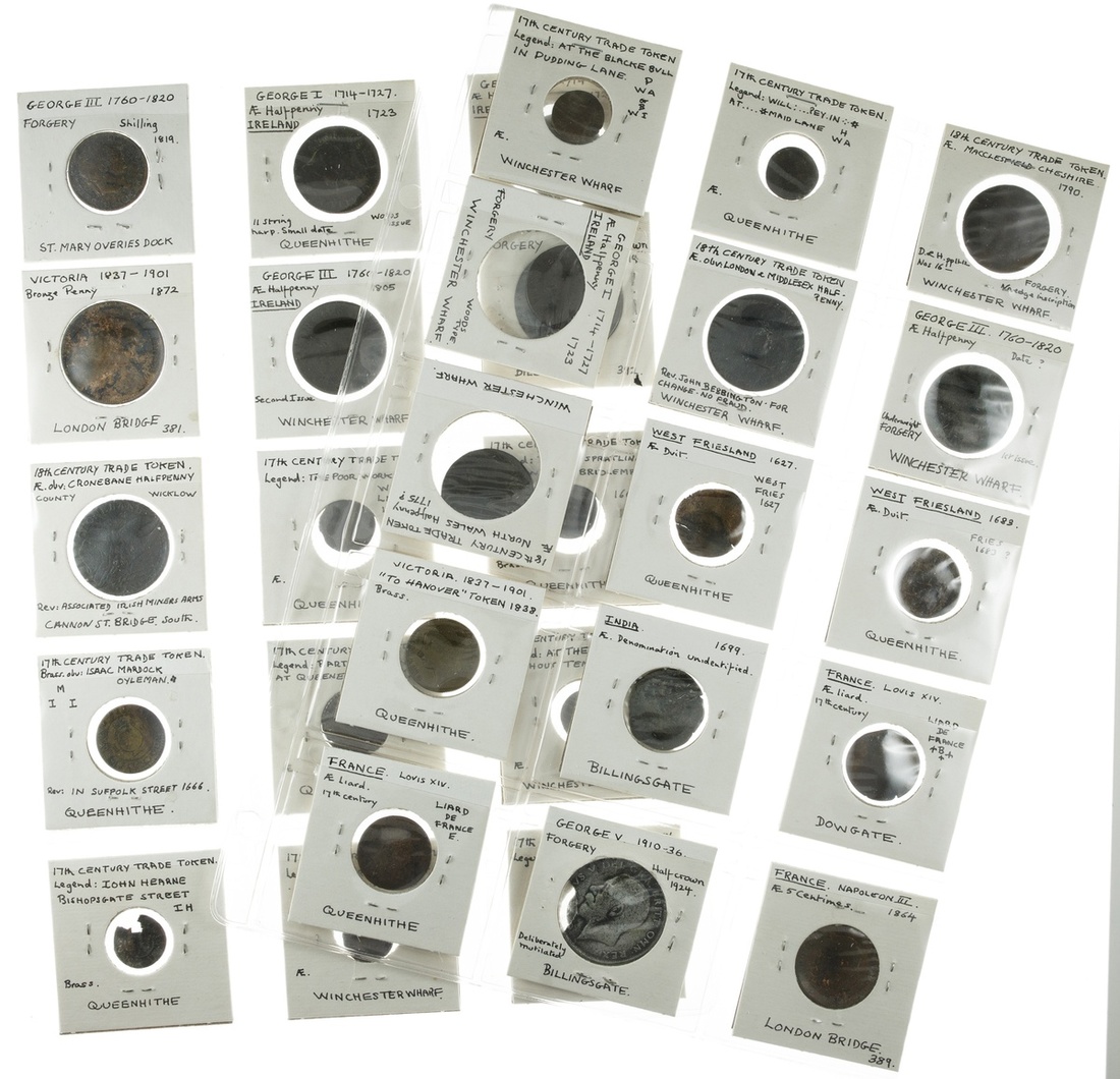 Great Britain. An urban archaeology lot of coins and tokens (114) dredged and dug in the River Thames area. Coins, generally 17th-19th Century, though includes 2 Elizabeth I Pennies, from Great Britain, Ireland, Netherlands, Sweden, Russia, Portugal and Italy; also contemporary counterfeits; Tokens include wharf tallies, 17th Century Trade, Nurnberg Jetons, coin weights, and tollgate tokens. Each identified as to where it was found - Billingsgate, Queenhithe, London Bridge, Winchester Wharf, Dowgate, Cannon Street Bridge, St. Mary Overie's Dock, and Southwark Bridge. A few with holes. Fair to Fine. From the Collection of the noted archaeologist Ivor Noel Hume, OBE (1927-2017), chief archaeologist at Colonial Williamsburg and director of its archaeology program. (114)