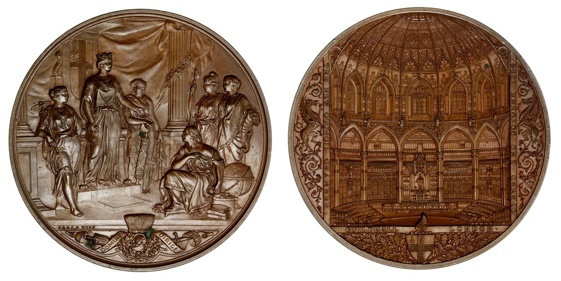 Great Britain. Victoria (1837-1901). New Council Chamber, Guildhall 1884. Corporation of London Medal. Bronze, 77mm, 10mm thick. By J.S. & A.B. Wyon. Detailed interior view of the Council Chamber flanked by two heraldic panels, City of London shield in ex., rev. Londinia standing right before the civic chair, attended by Mercury and Commerce, addressing her council. BHM 3177, Eimer 1705, Taylor 206a. Tiny green deposit lower obverse. Chestnut brown. About Uncirculated.