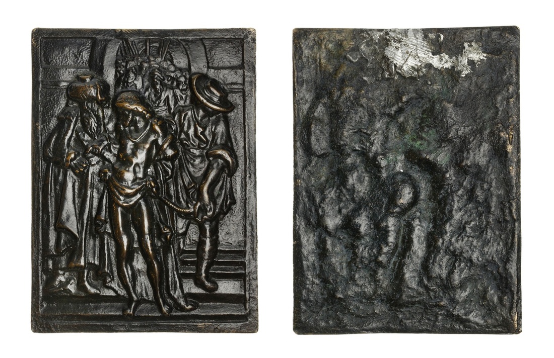 Germany. Ecce Homo. Bronze plaquette cast after an early 17th Century model. 85 x 115mm. Christ at center wearing a short perizonium and cloak, His hands bound behind, flanked by a turbaned High Priest and a man wearing a wide-brimmed hat and holding the rope; a group of figures gathered in an archway in the background. Cf. Bange 7048. Soldermark on back, otherwise Extremely Fine.