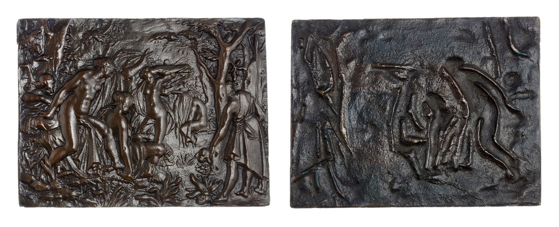 Netherlands. Diana and Actaeon. Rectangular plaquette. Bronze, 128 x 97mm, 1610. Diana bathing in a spring with the help of her escort of nymphs, the young hunter Actaeon unwittingly espies them from behind a tree at the right. Cf.Weber 974 (lead example in the Museo Nazionale del Bargello, Florence; iron example Augsburg Museum). This is apparently the only reported example in bronze. An Extremely Fine later cast.