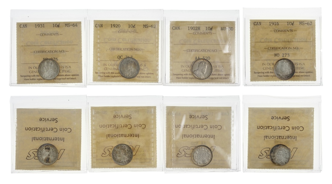 Canada. Edward VII-George V. Quartet of ICCS-graded 10 Cent pieces: 1902-H. AU-50; 1916. Toned. MS-62; 1920. MS-62; and 1931. MS-64. (4).
